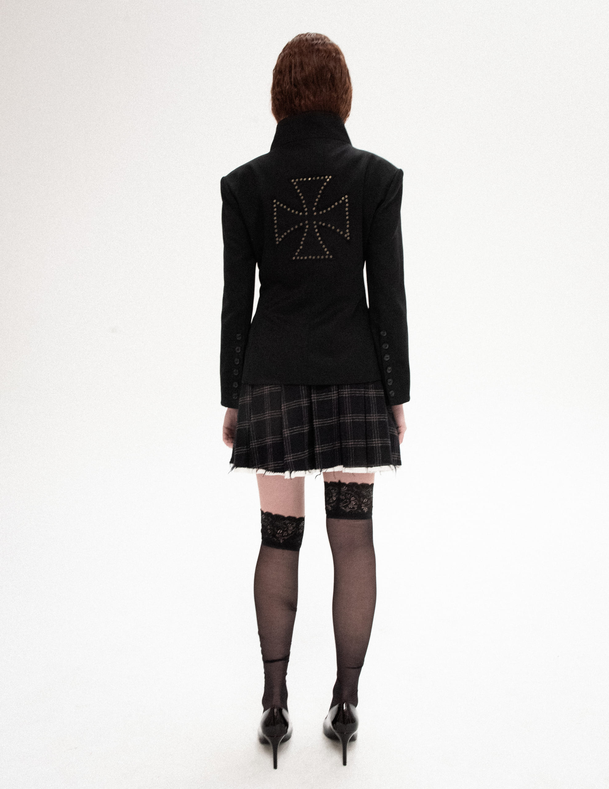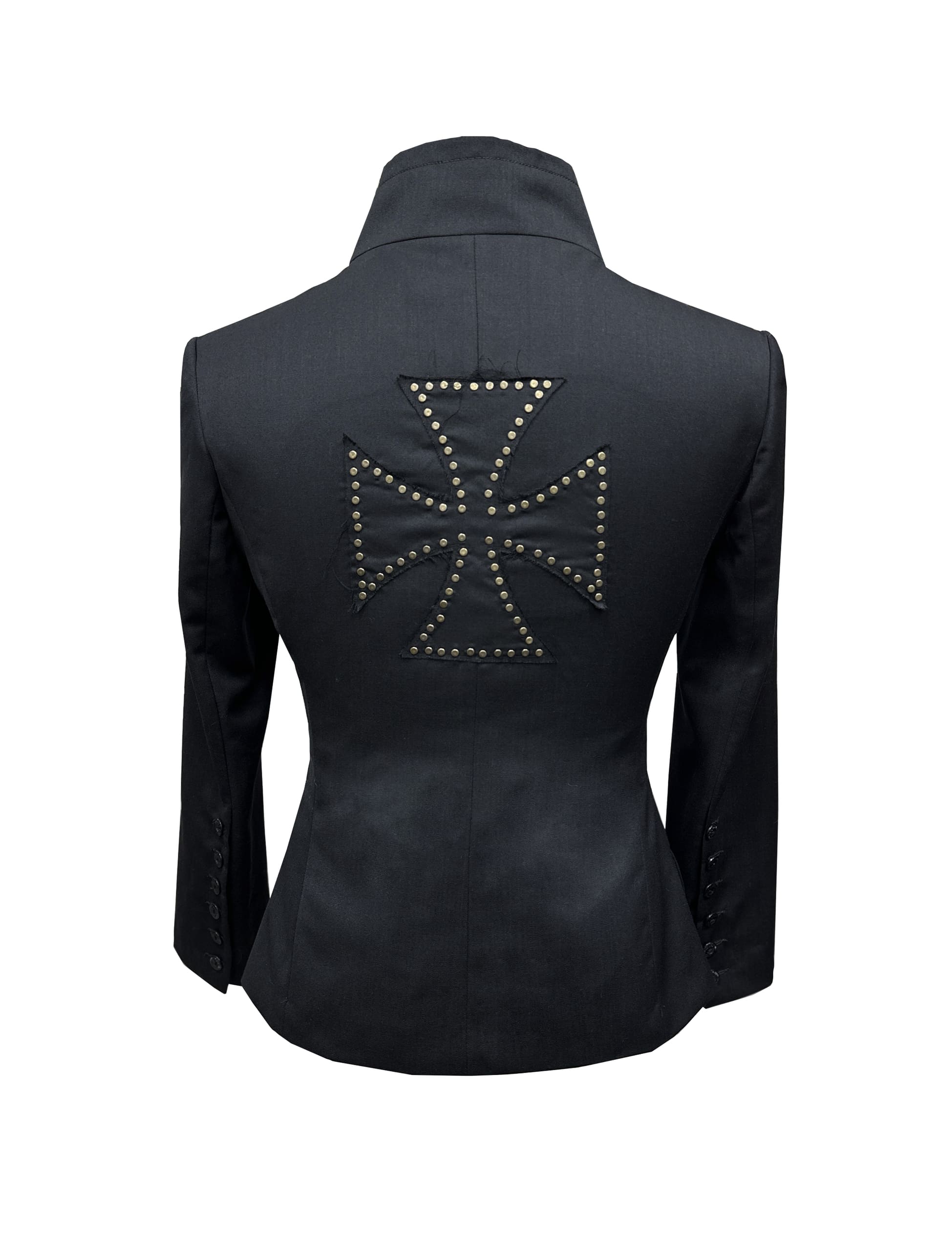 The frontal display of 10 artisanal buttons serves as a focal point of authority, mirrored by extended tailored sleeves with 6-button cuffs that elongate the arms for a dramatic, commanding reach. On the back, our signature biker-style cross patch—hand-stitched and reinforced with micro-rivets—serves as a silent badge of deviance and devotion. This is not just a blazer; it is ceremonial armor designed for the modern predator who masters the arena of the night.