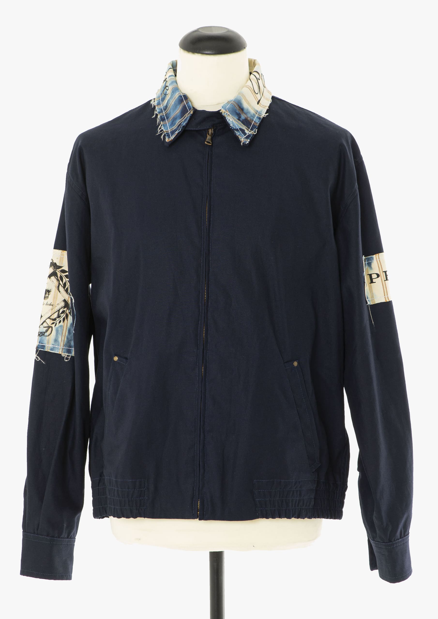 Bomber jacket. Silk screened patches on sleeves and back. All over hand printed basting stitch pattern. Knit ribbing at cuffs and waist Lining with silk screen print.