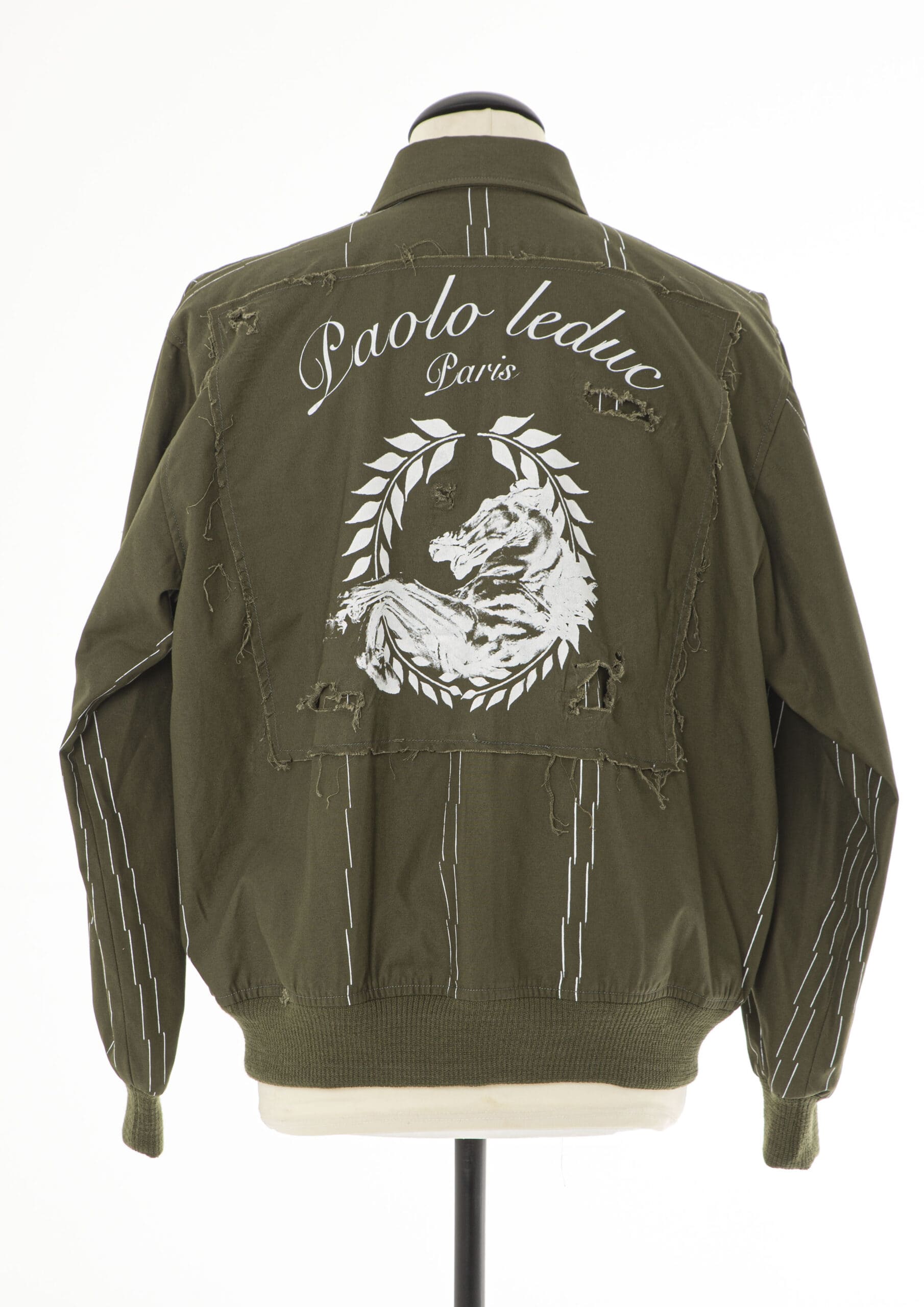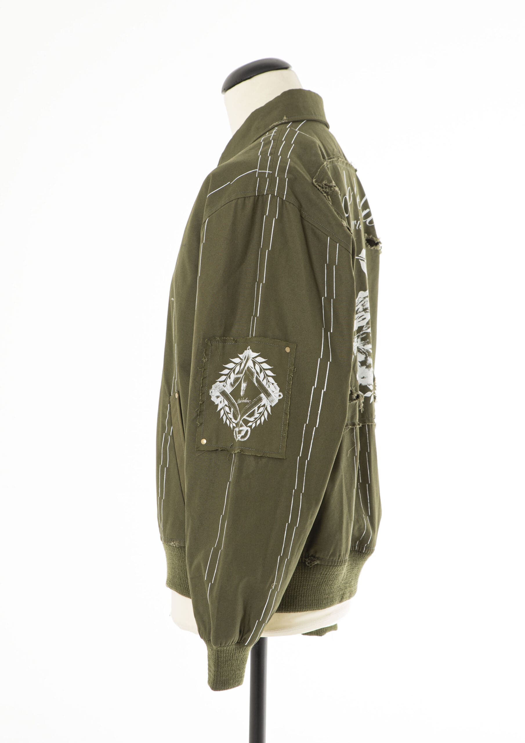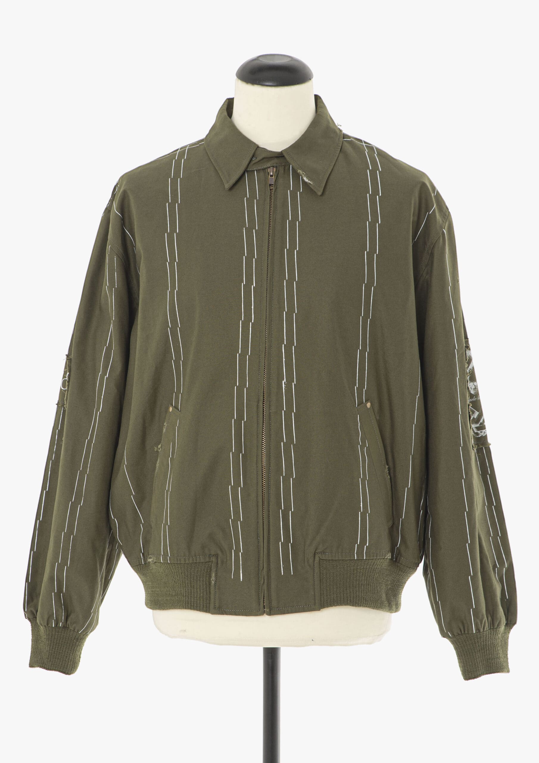 Bomber jacket. Silk screened patches on sleeves and back. All over hand printed basting stitch pattern. Knit ribbing at cuffs and waist Lining with silk screen print.