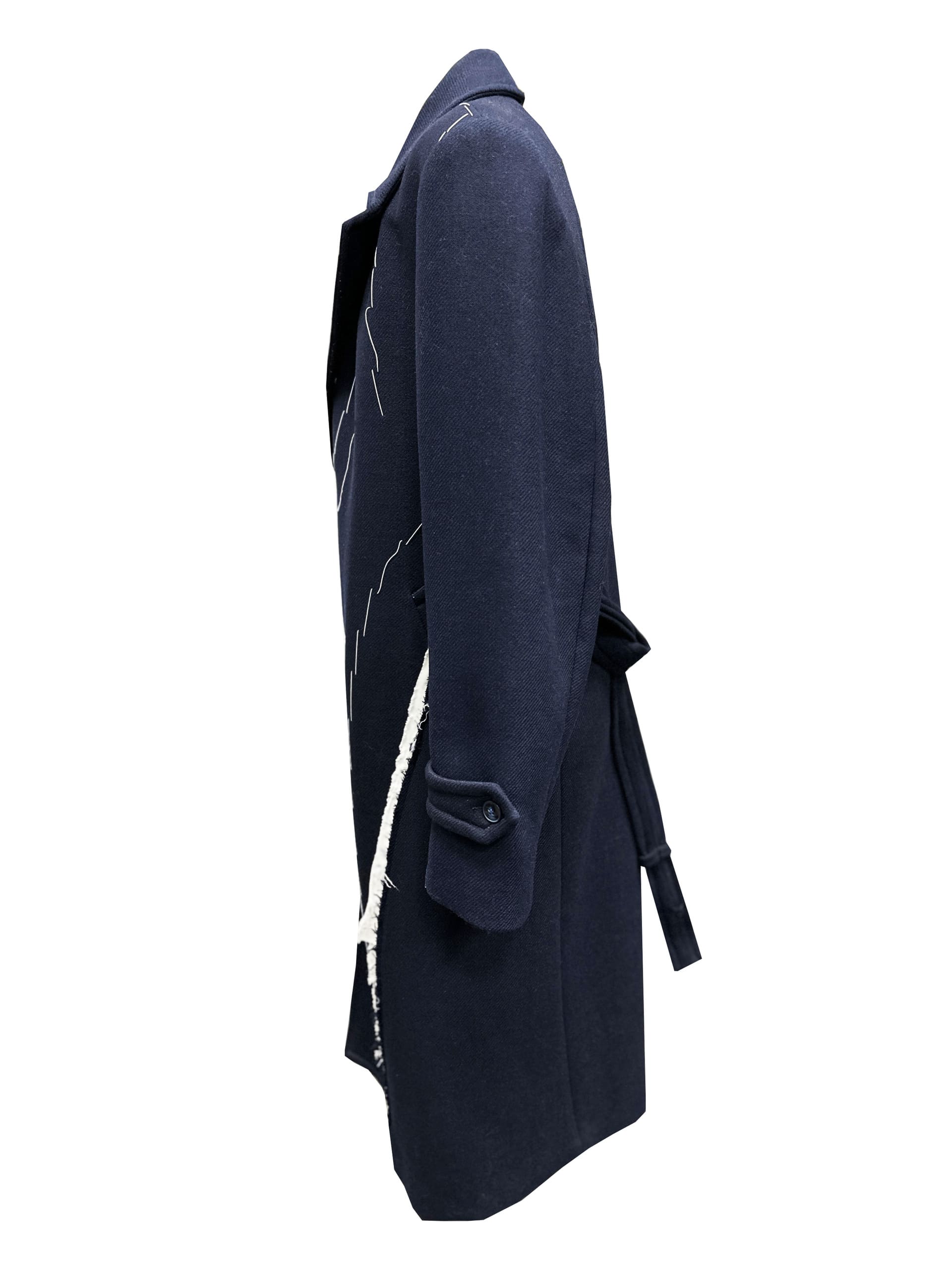 The Scarred Chesterfield takes the rigidity of traditional outerwear and dissects it, creating a new syntax for the classic silhouette. Crafted from an ultra-heavy midnight blue wool, this long coat falls below the knee, offering a timeless shape that is radically altered by calculated chaos.