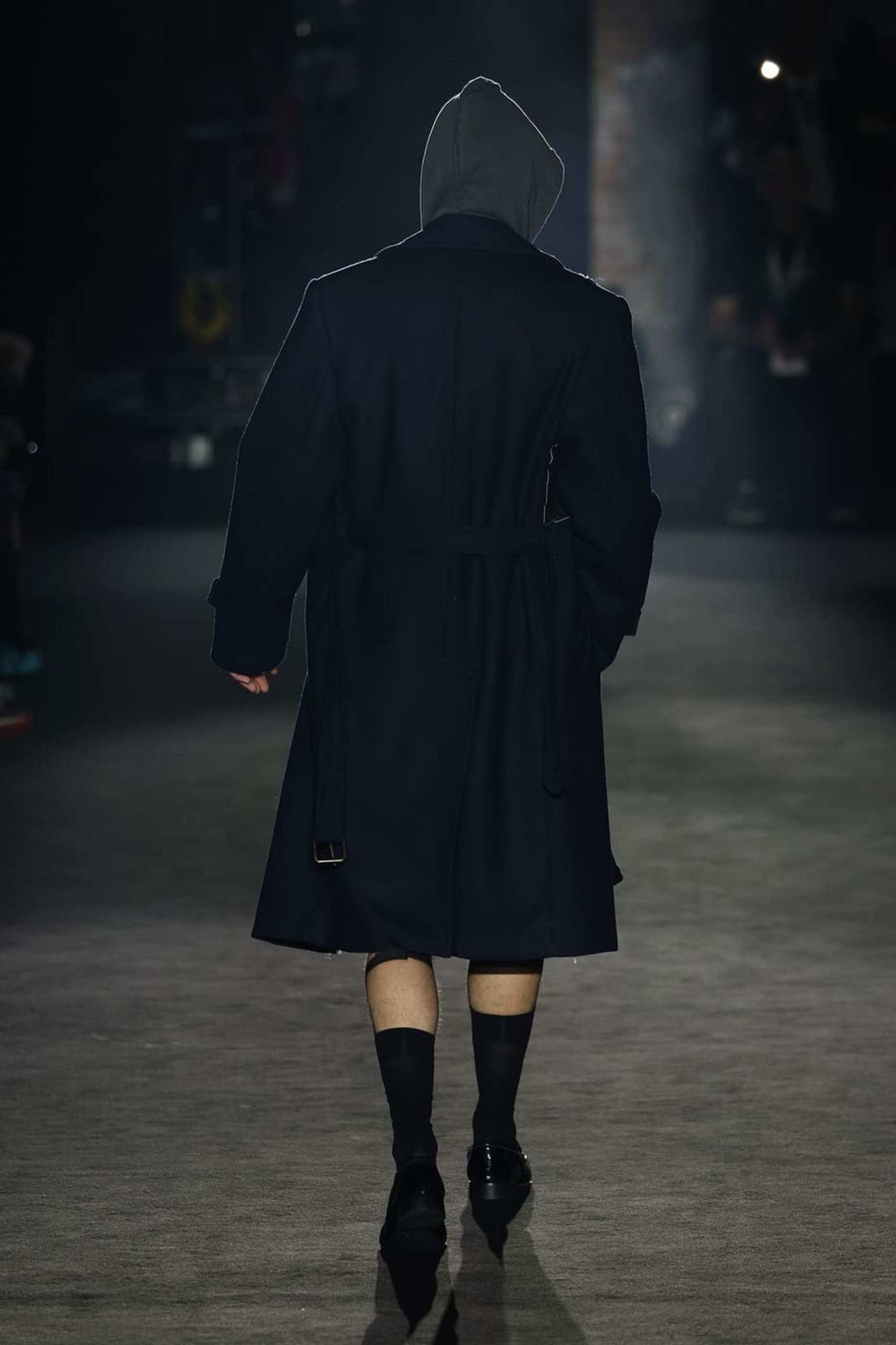 The right front panel is surgically severed, cutting through the structure and pocket. These sections are then reassembled askew, creating a tension where the right pocket loses its function in favour of form. This disruption is highlighted by a raw, distressed trim inserted between the cuts—a deliberate exposure of the coat’s inner workings. The left side features a similar, more subtle incision placed lower down to ensure the pocket remains functional. The interior reveals an unexpected flash of luxury: a rich, golden satin lining that contrasts sharply with the coat’s raw exterior edge.