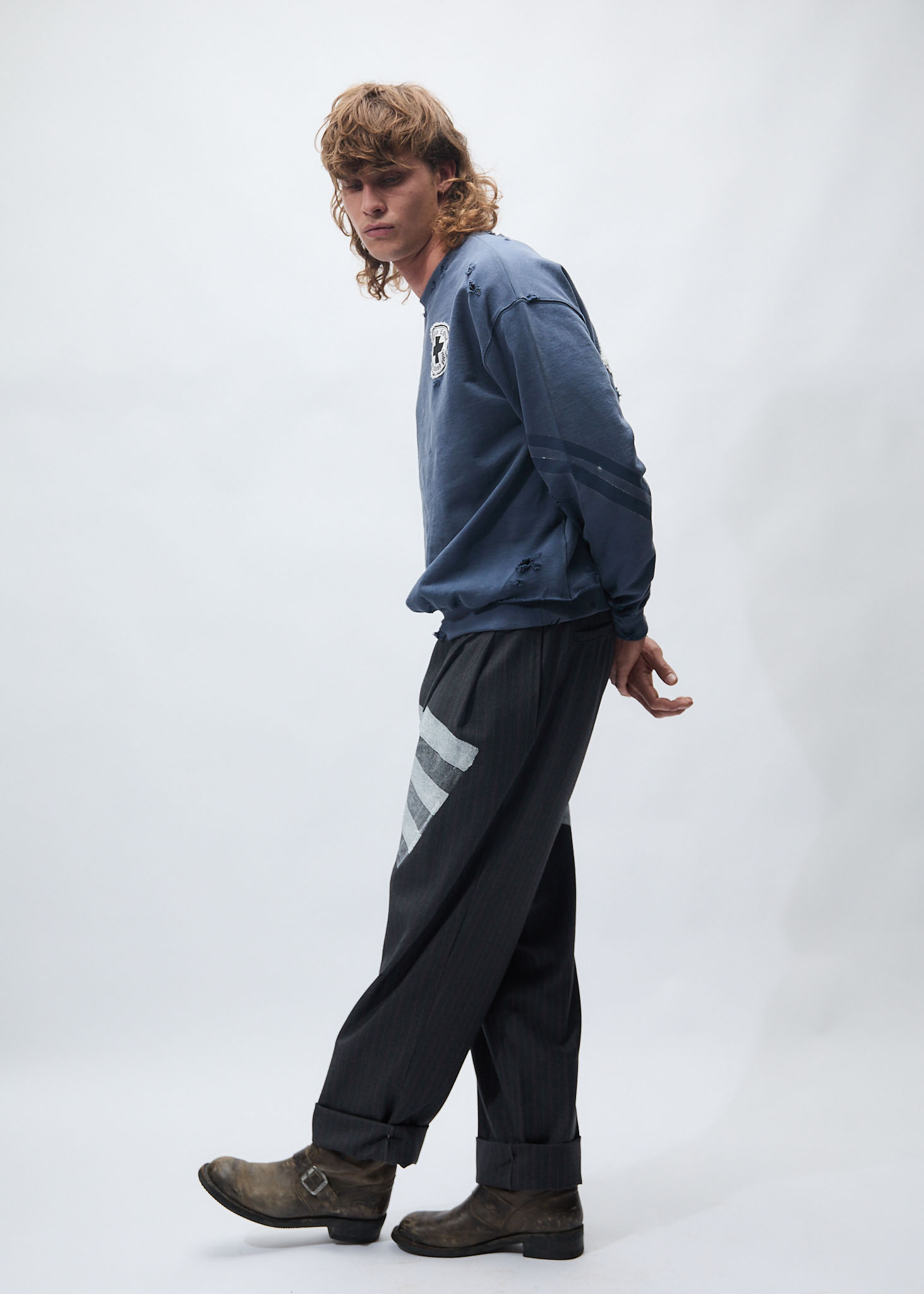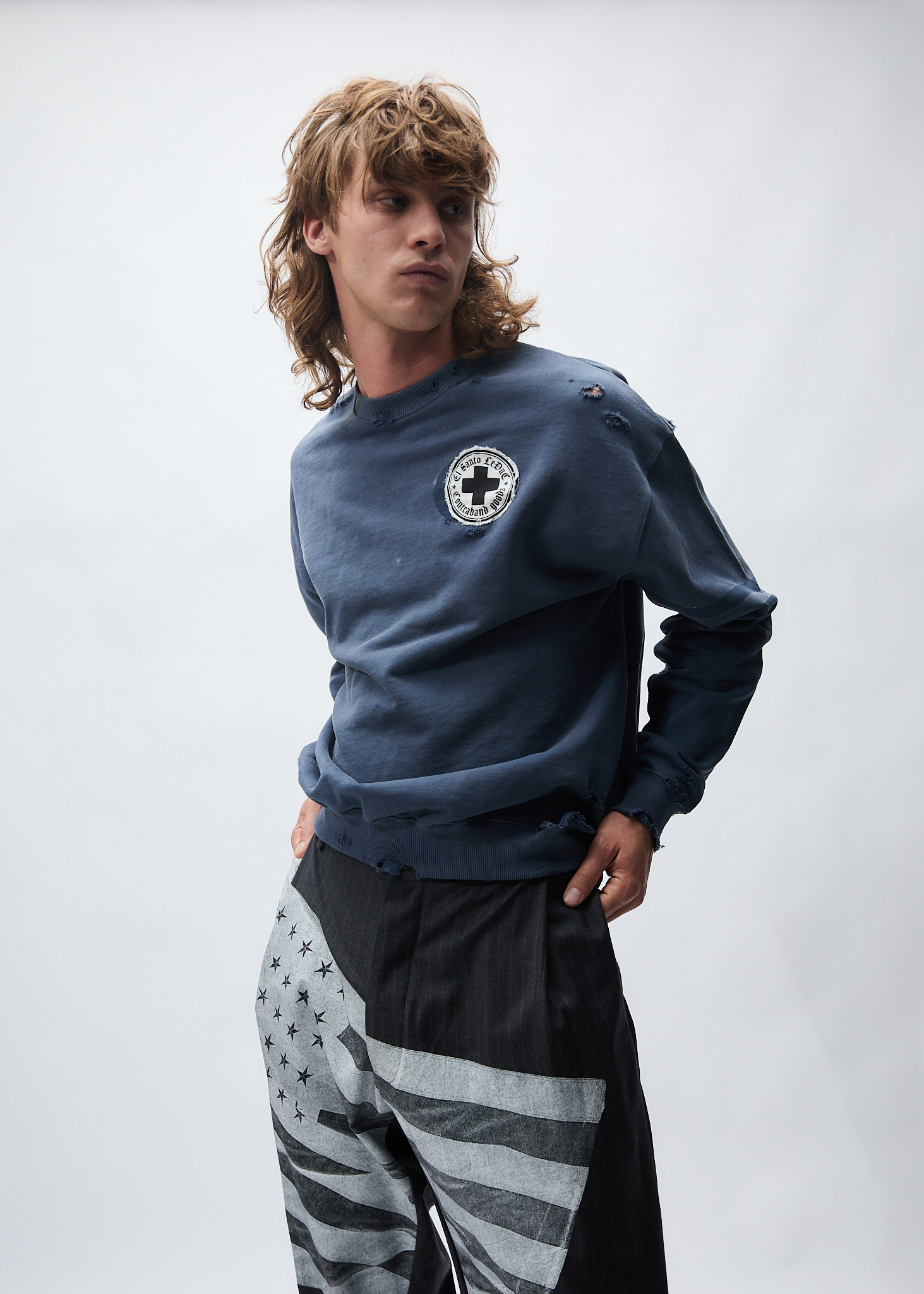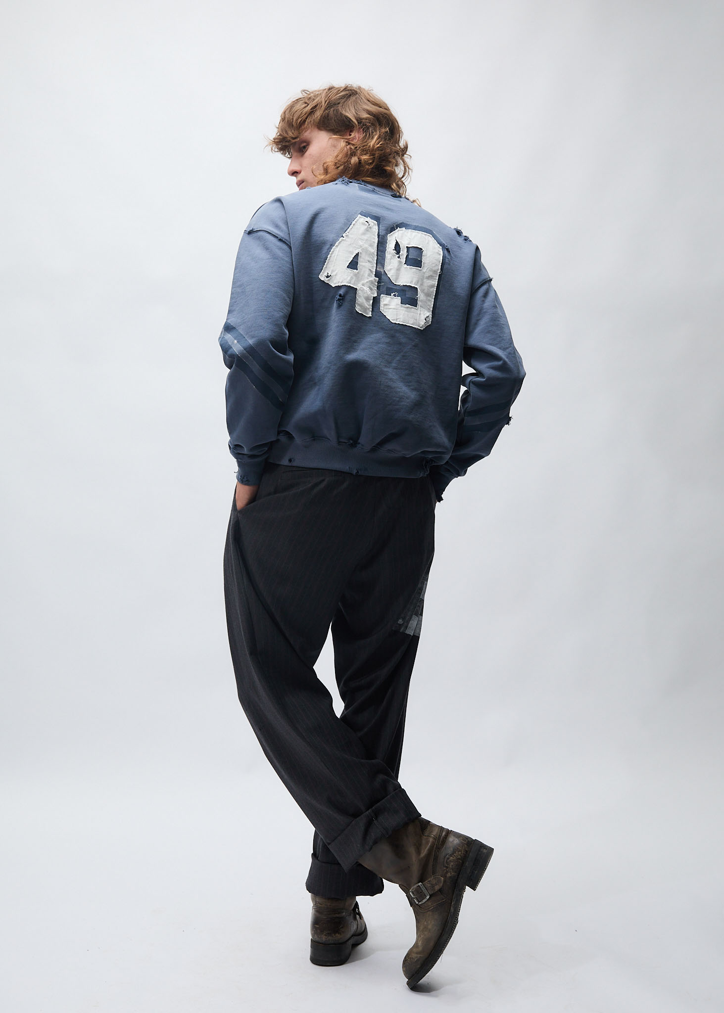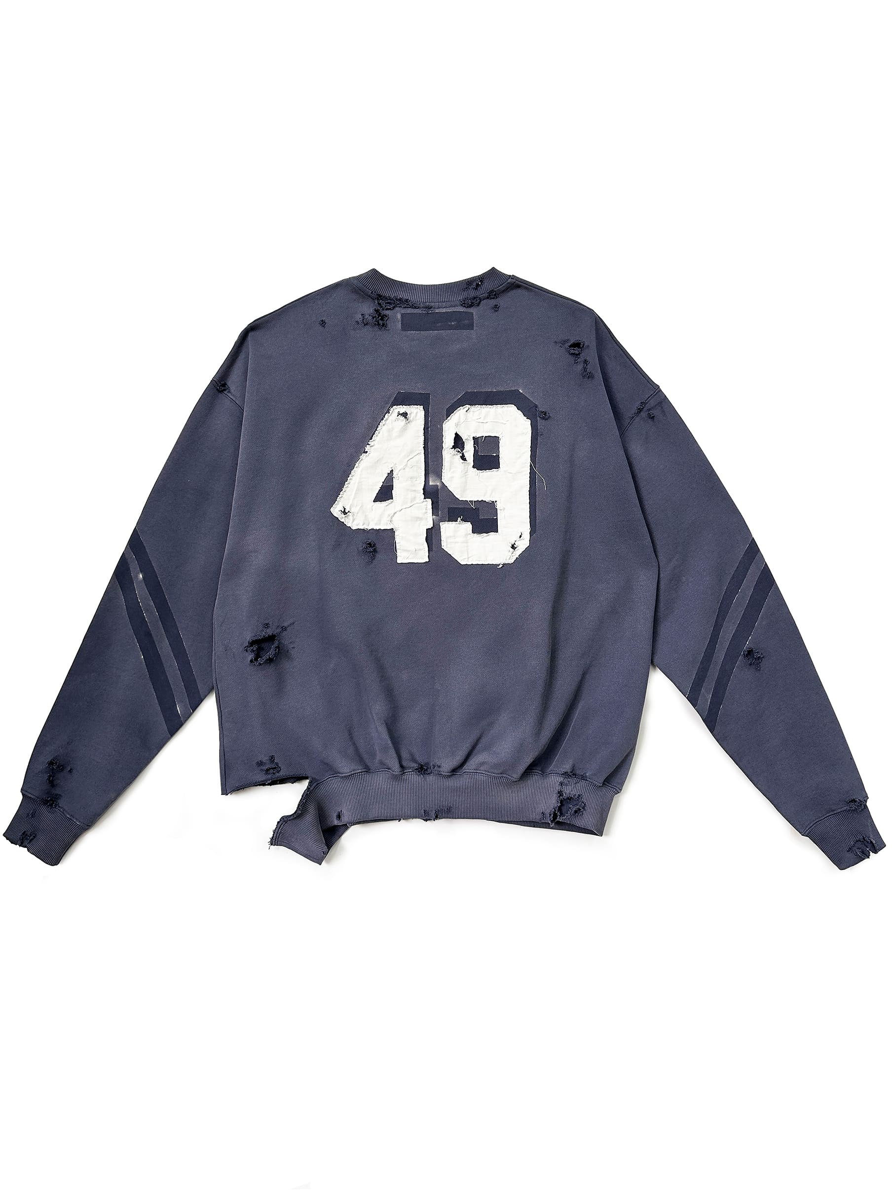 Hand-washed crewneck, one by one. Front and back patches removed after washing and sewn shifted. Two strips on sleeves removed after washing, leaving the actual color of the shirt.