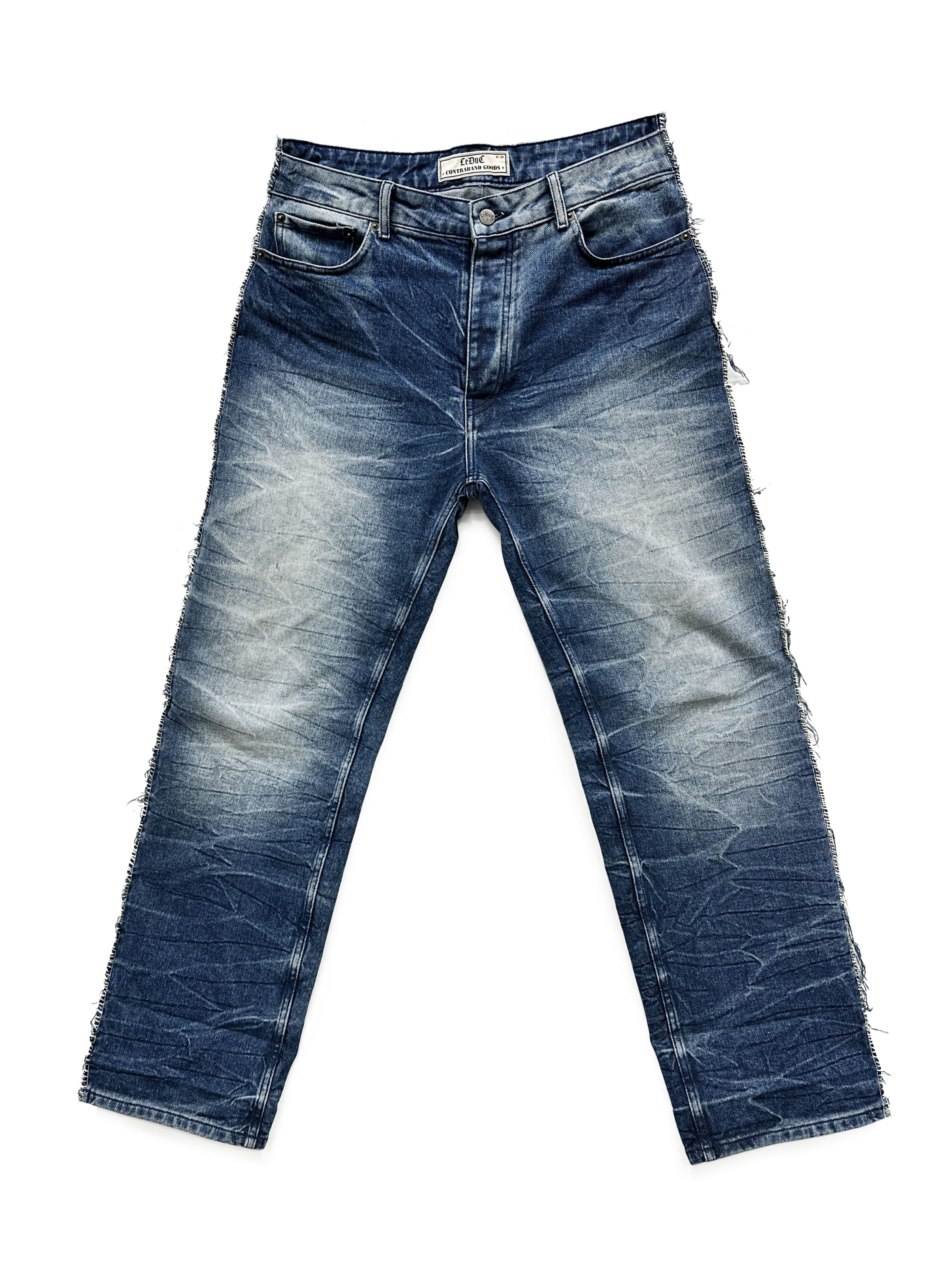 The left front pocket features a subtle twist and raw edge, finished with Leduc’s distinctive branded hem. Both front pockets and the left back pocket are hand-stitched, adding depth and individuality to each piece.