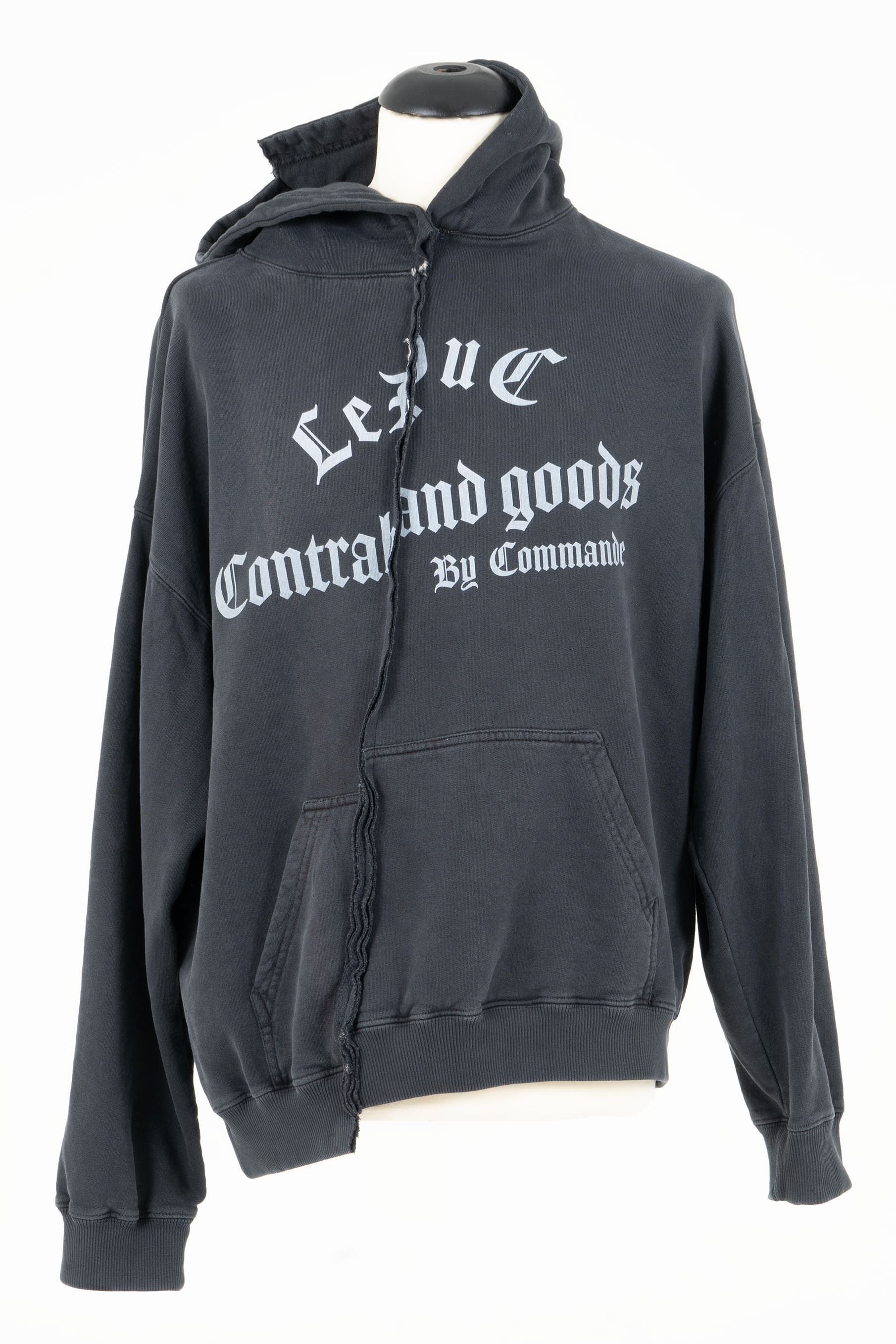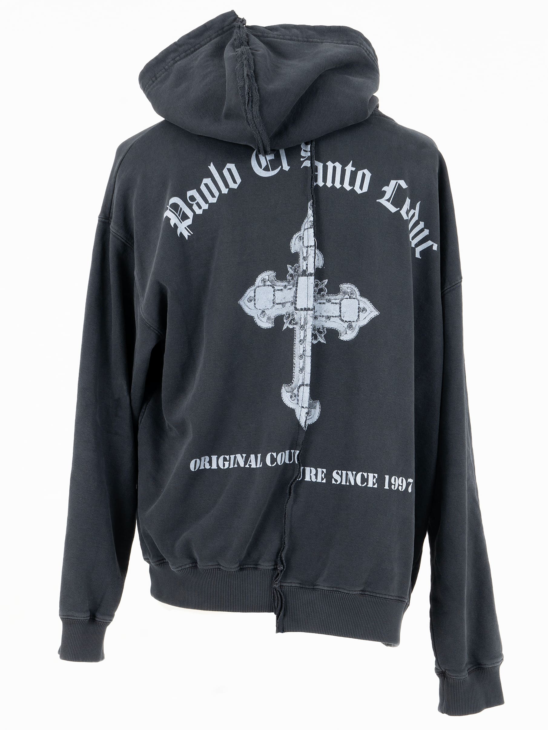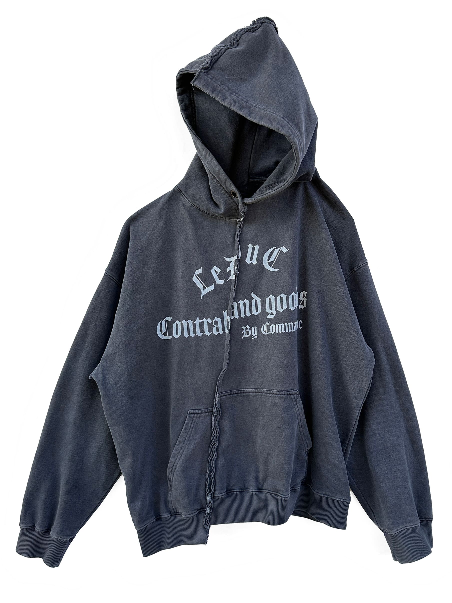 Hoodie oversize boxy fit, dropped shoulder, densely knitted brushed French terry with silk screen “LEDUC Contraband Goods” text in front and “PAOLO EL SANTO LEDUC and CROSS” design at back. Hand distressed holes and tears throughout. No Gender.