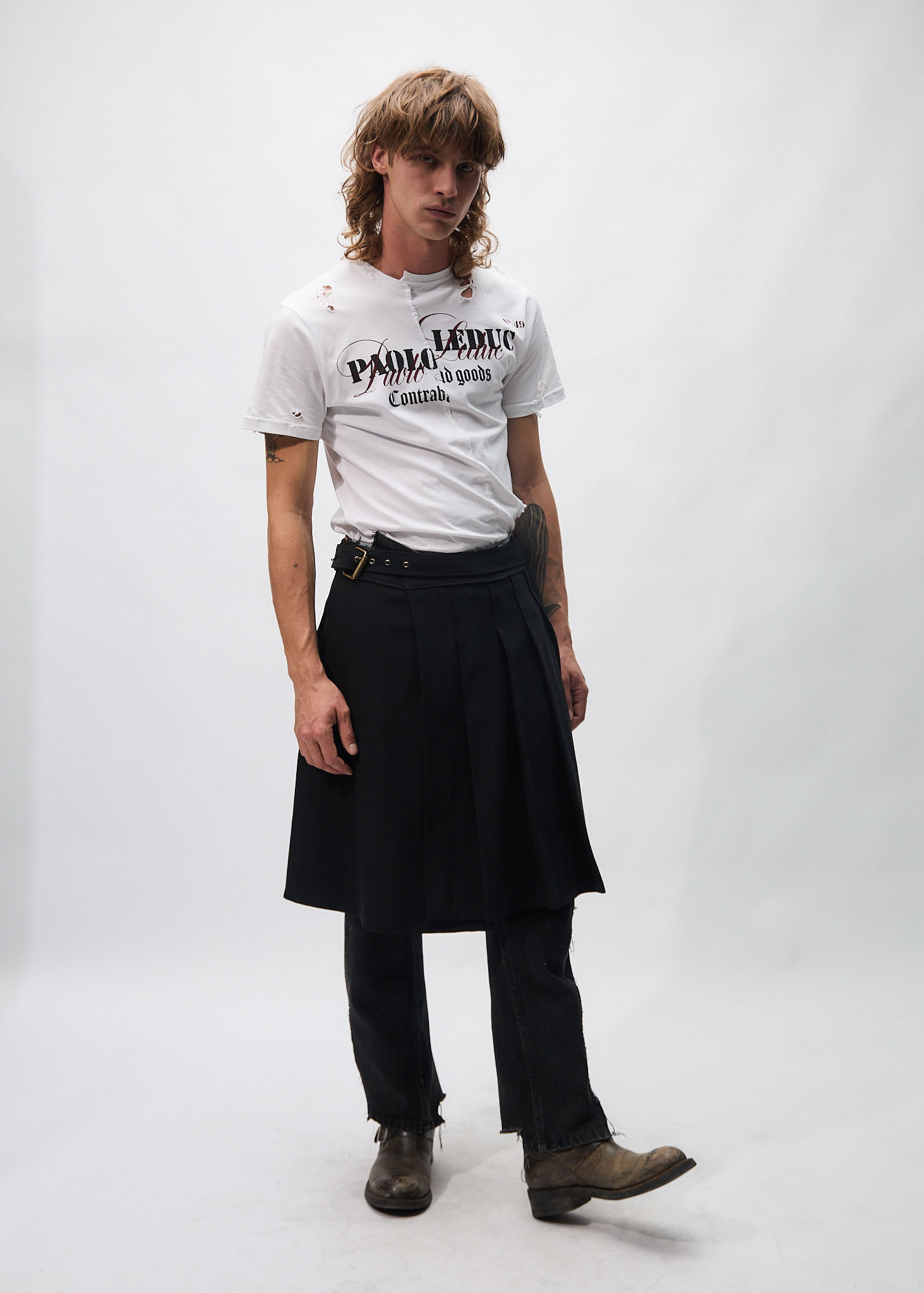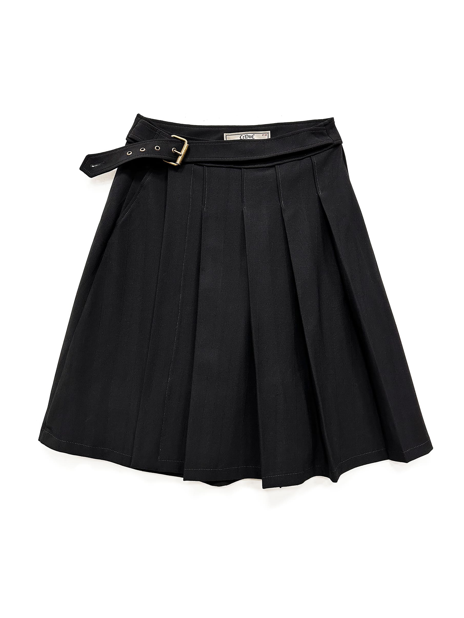 Skirt with pleats on the left side and back, ADJUSTABLE skirt, can be adjusted from size 36 to size 44. Belt in the front above the waistband, front pocket on the right side and a tailor pocket on the back right side. Front right lined. No gender.