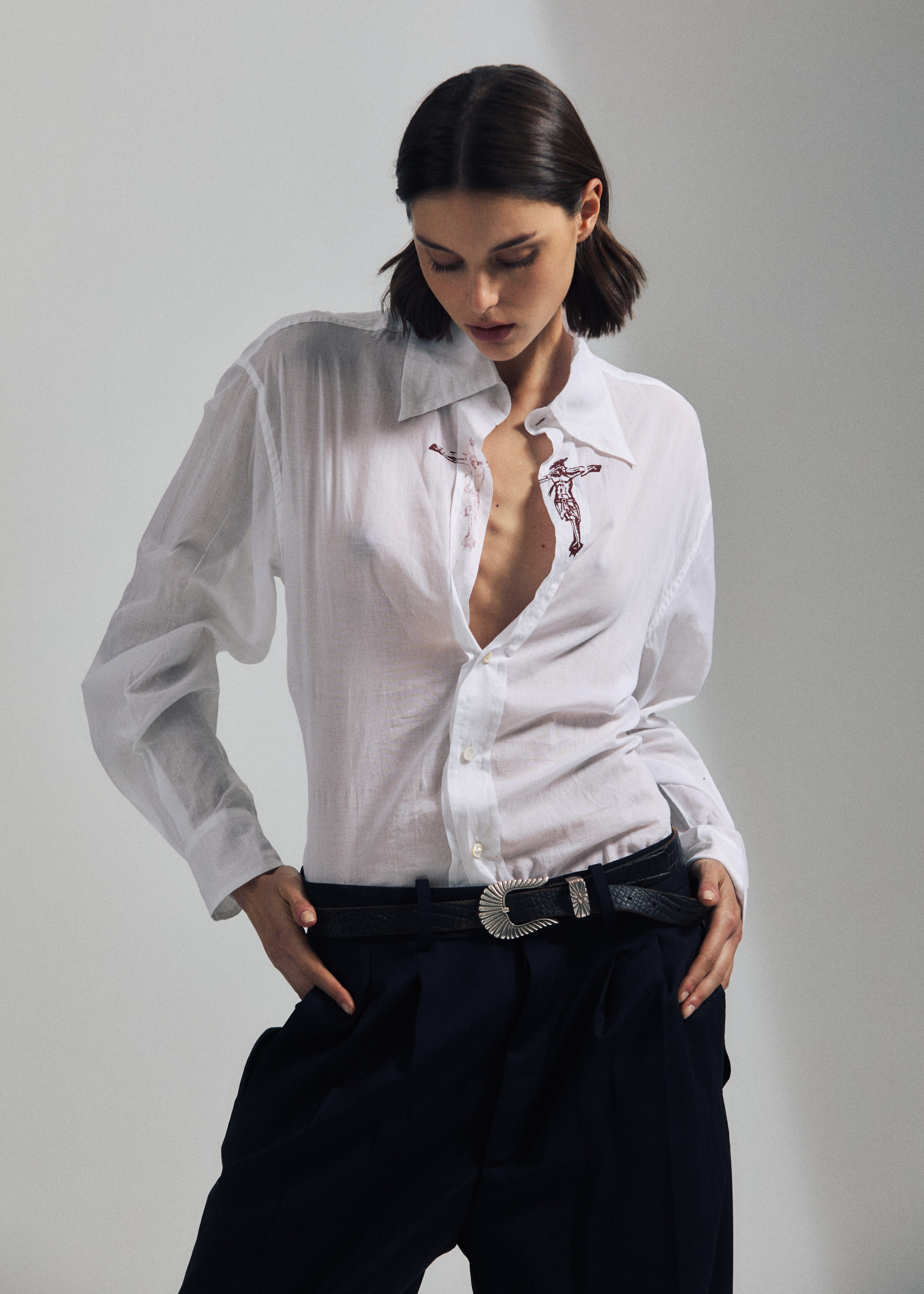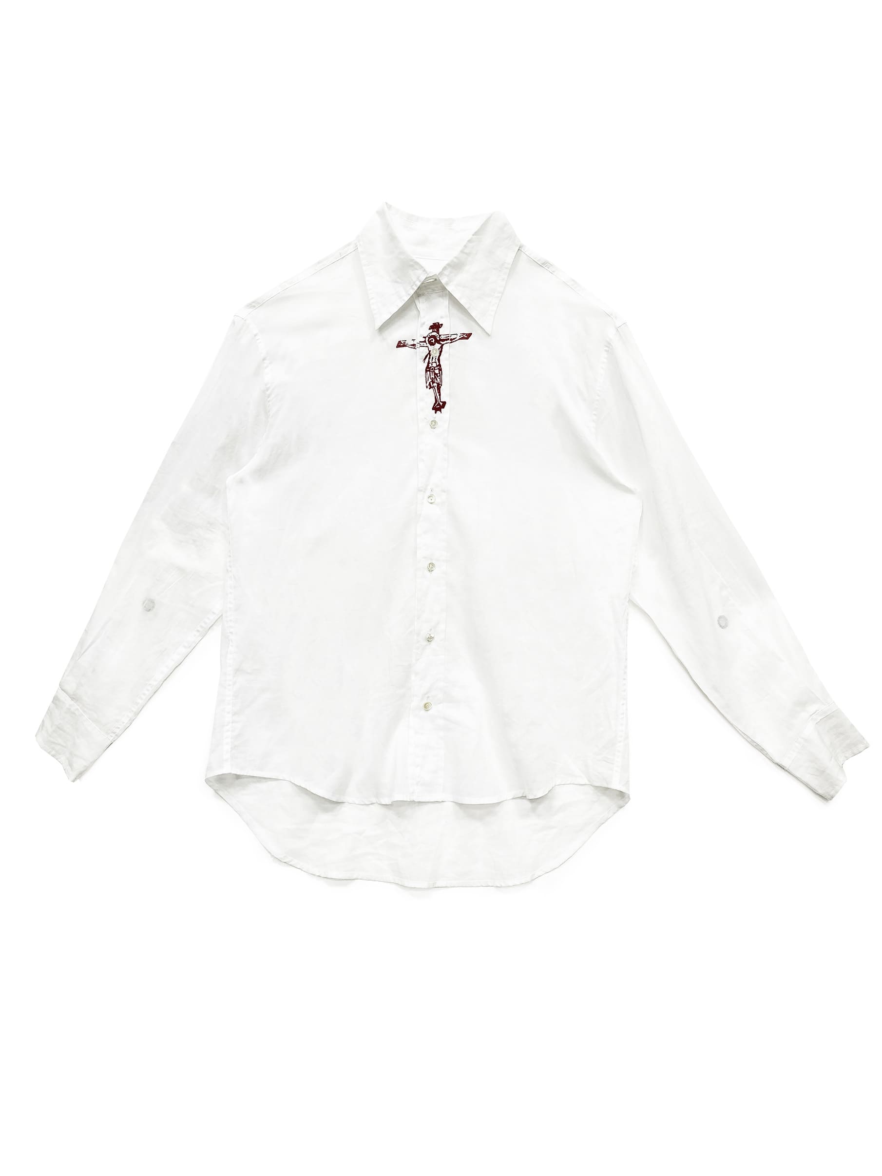 Transparent Muslin Regular fit shirt, silk screen print “ the Christ “ in red, with water base ink for a vintage effect. Made in transparent cotton. No gender.