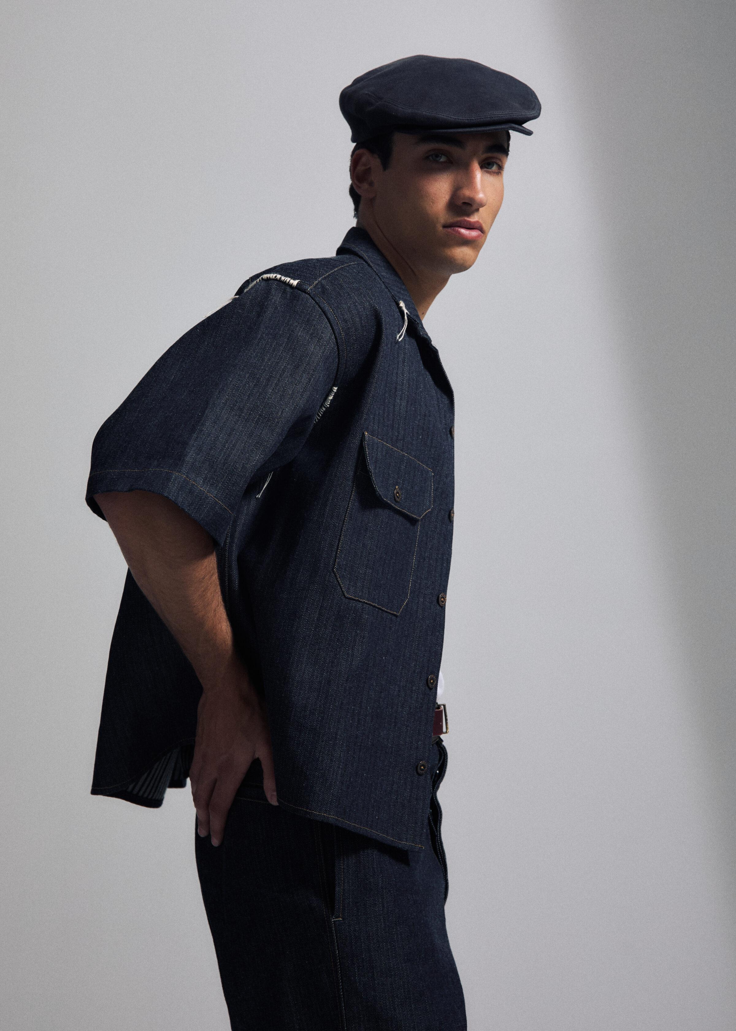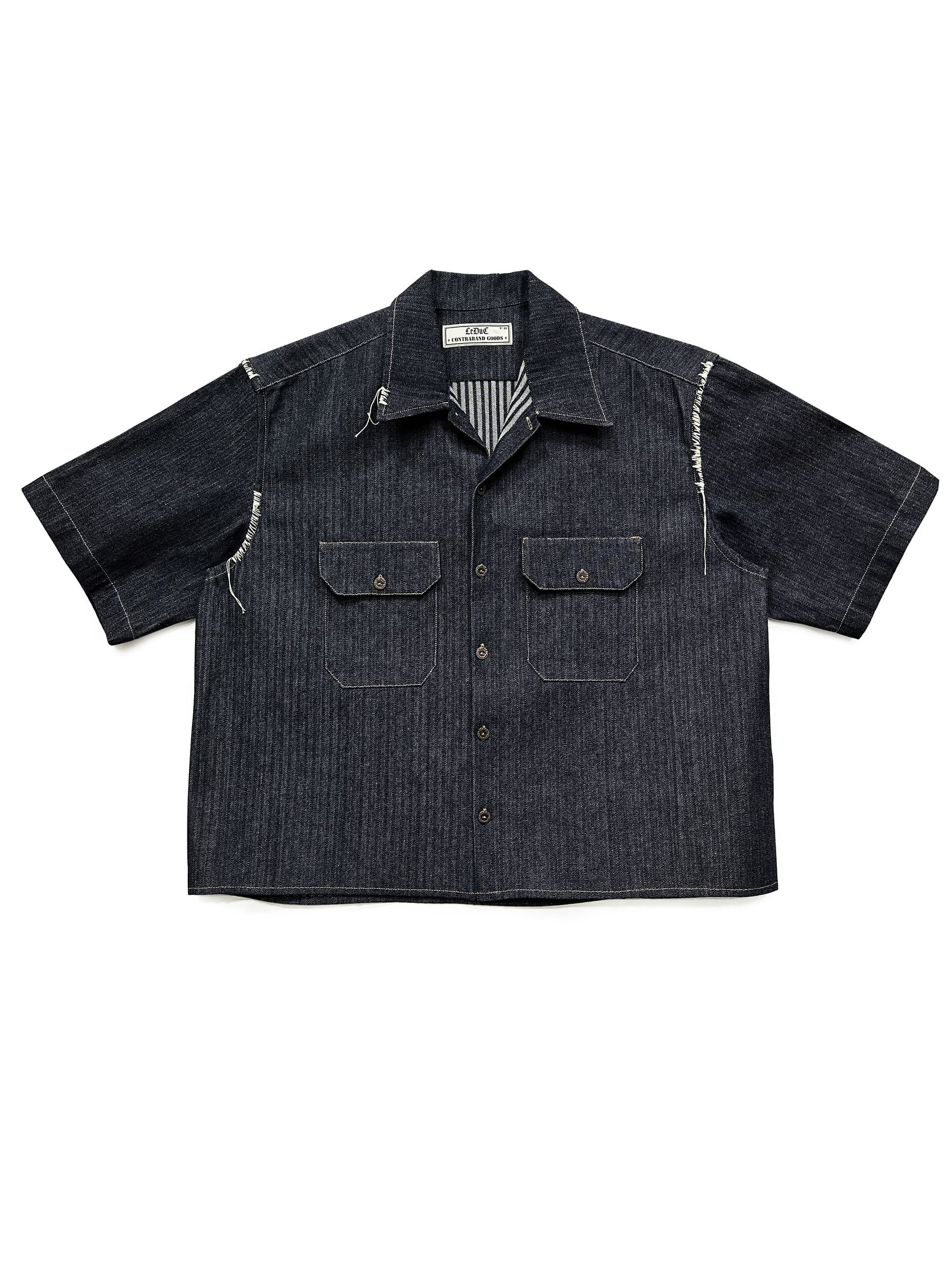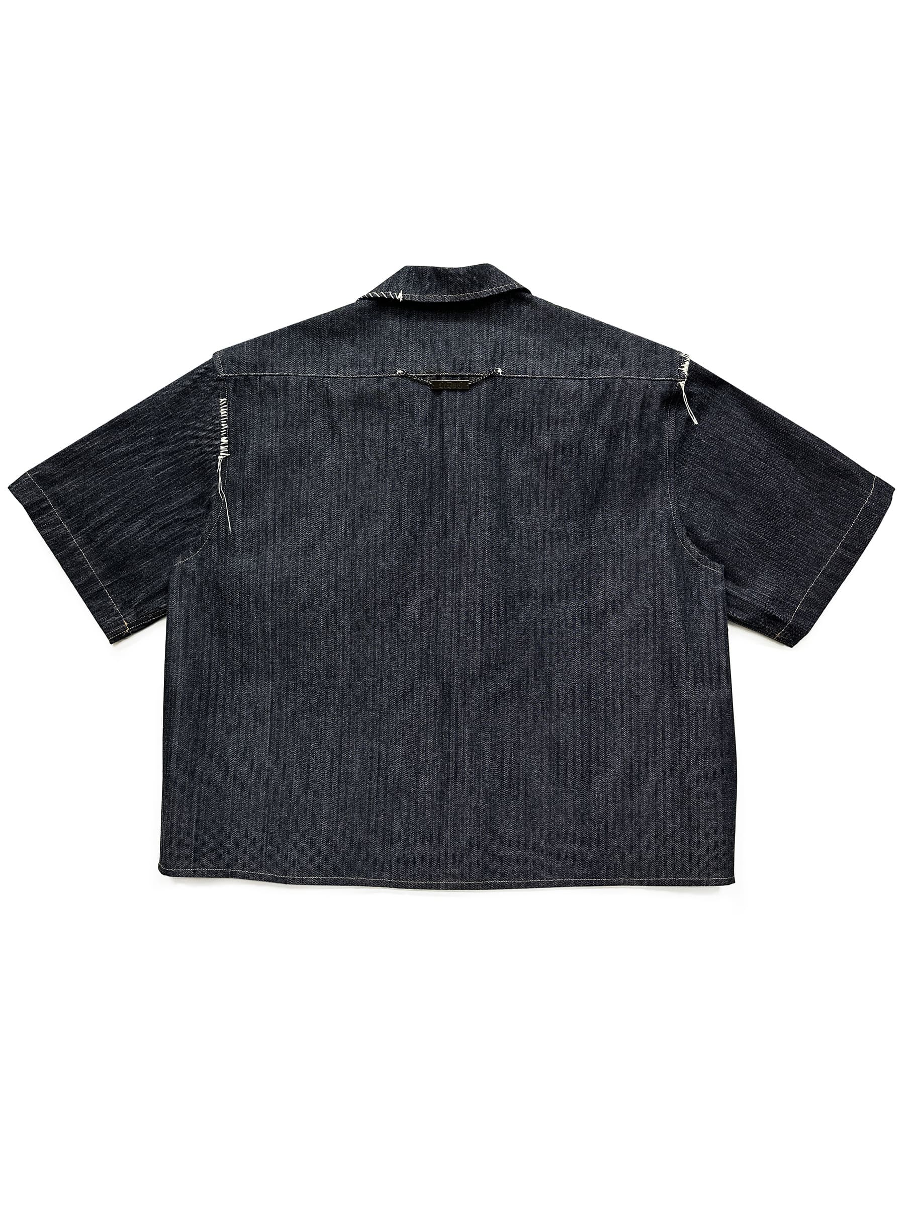 Oversize Short-sleeved workwear shirt in woven striped denim. Two front pockets.