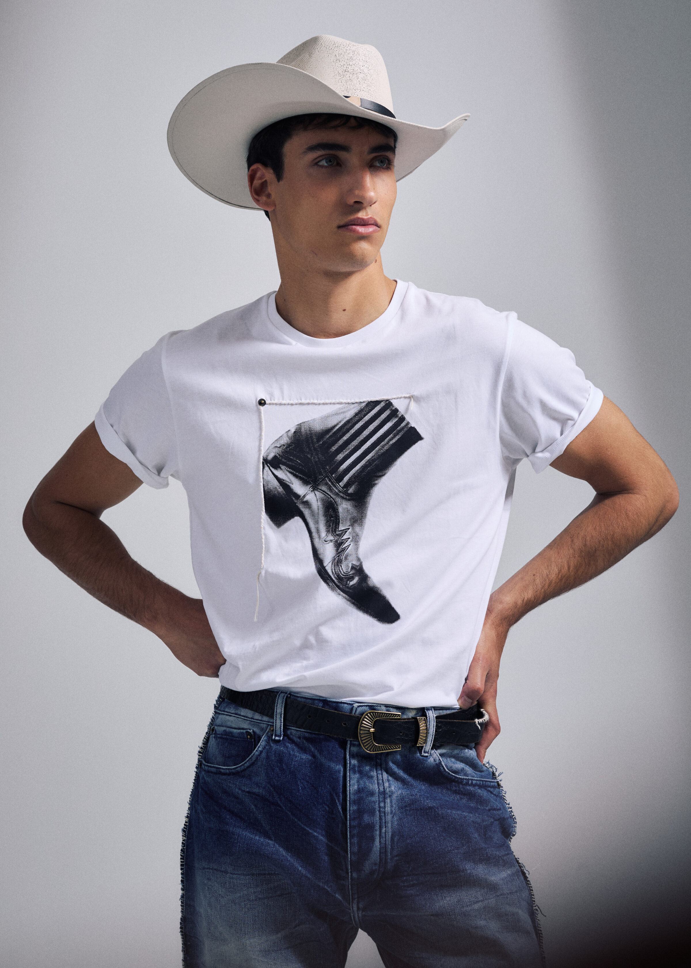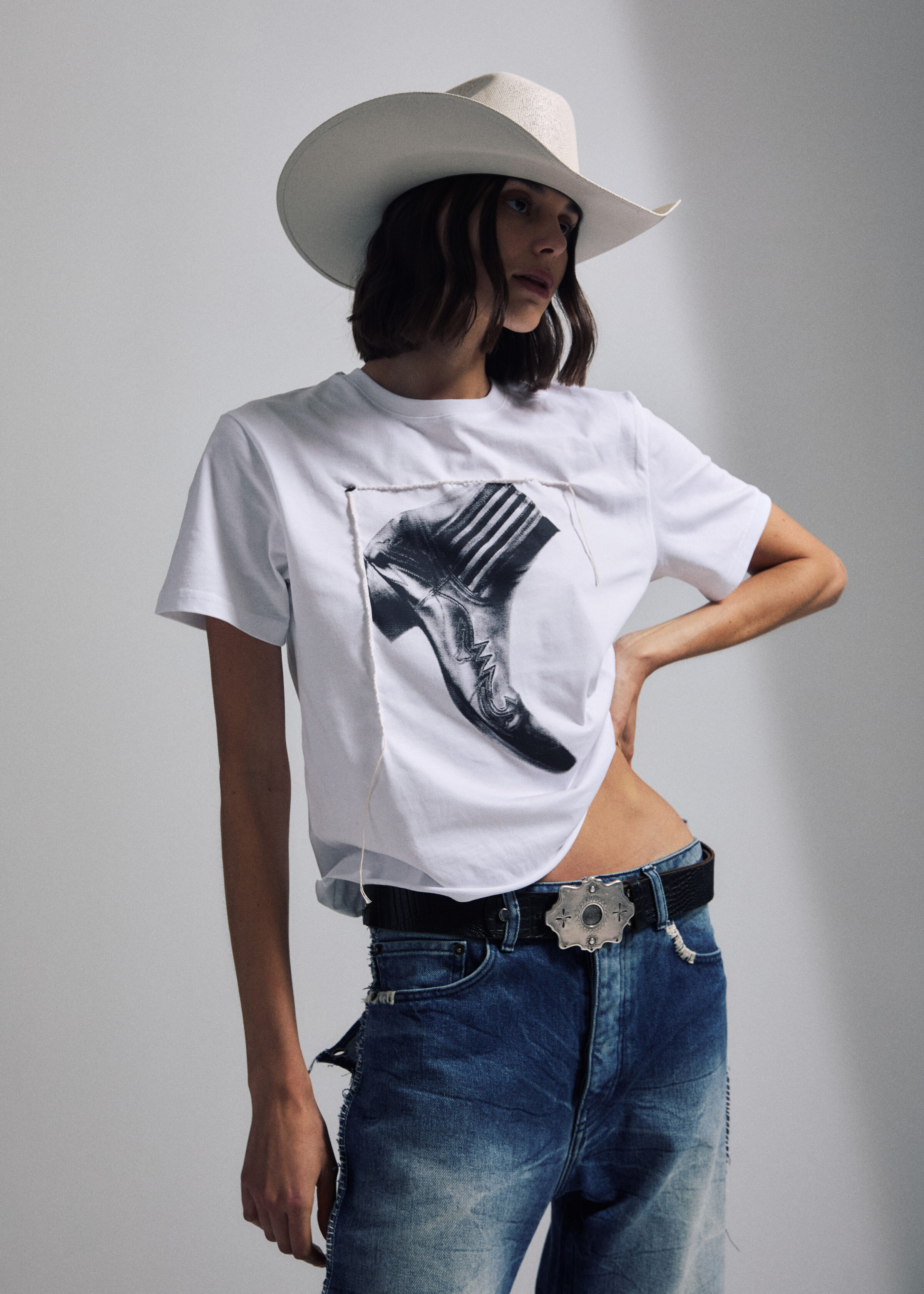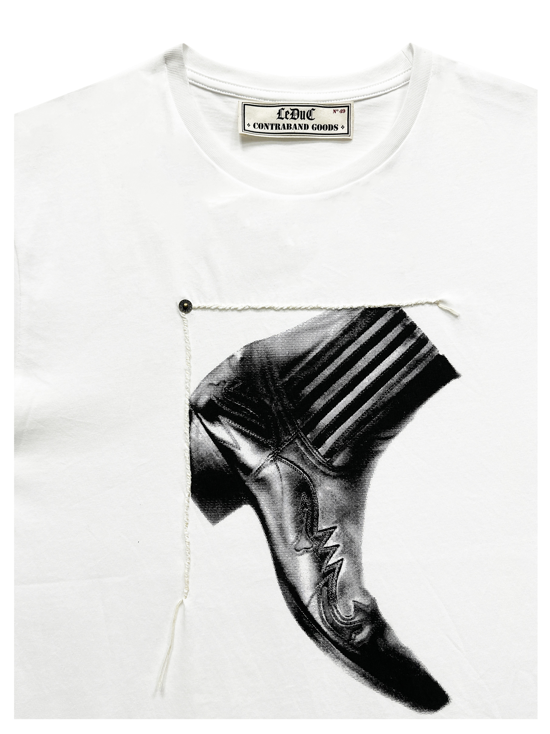Its standout feature is a silk-screened cowboy boot on the front, printed with water-based inks to achieve a subtle vintage effect that evolves with wear and washing. Two hand-stitched cuts frame the boot’s edges, accented by a signature “Leduc” rivet at the intersection of the seams—an understated mark of craftsmanship.