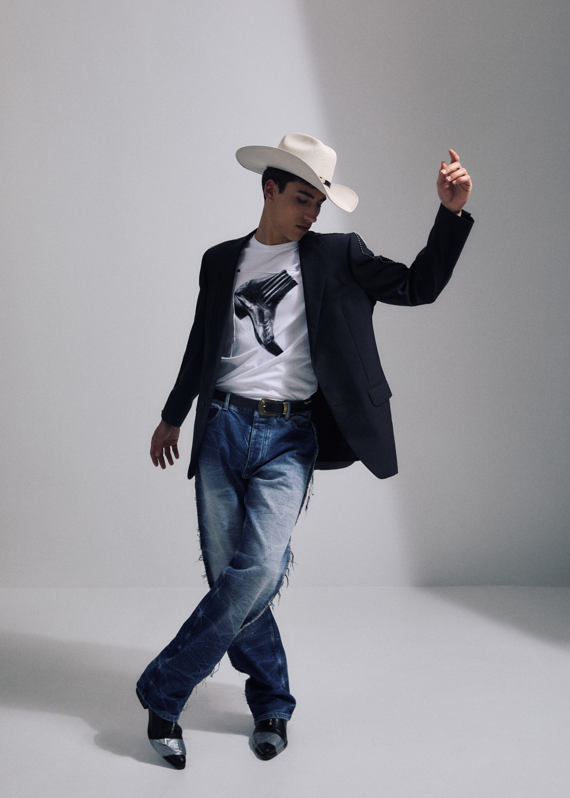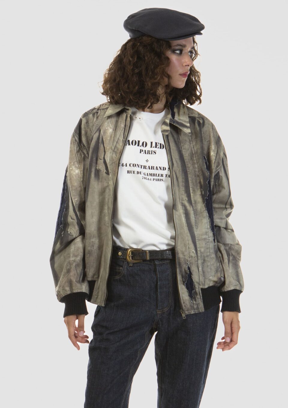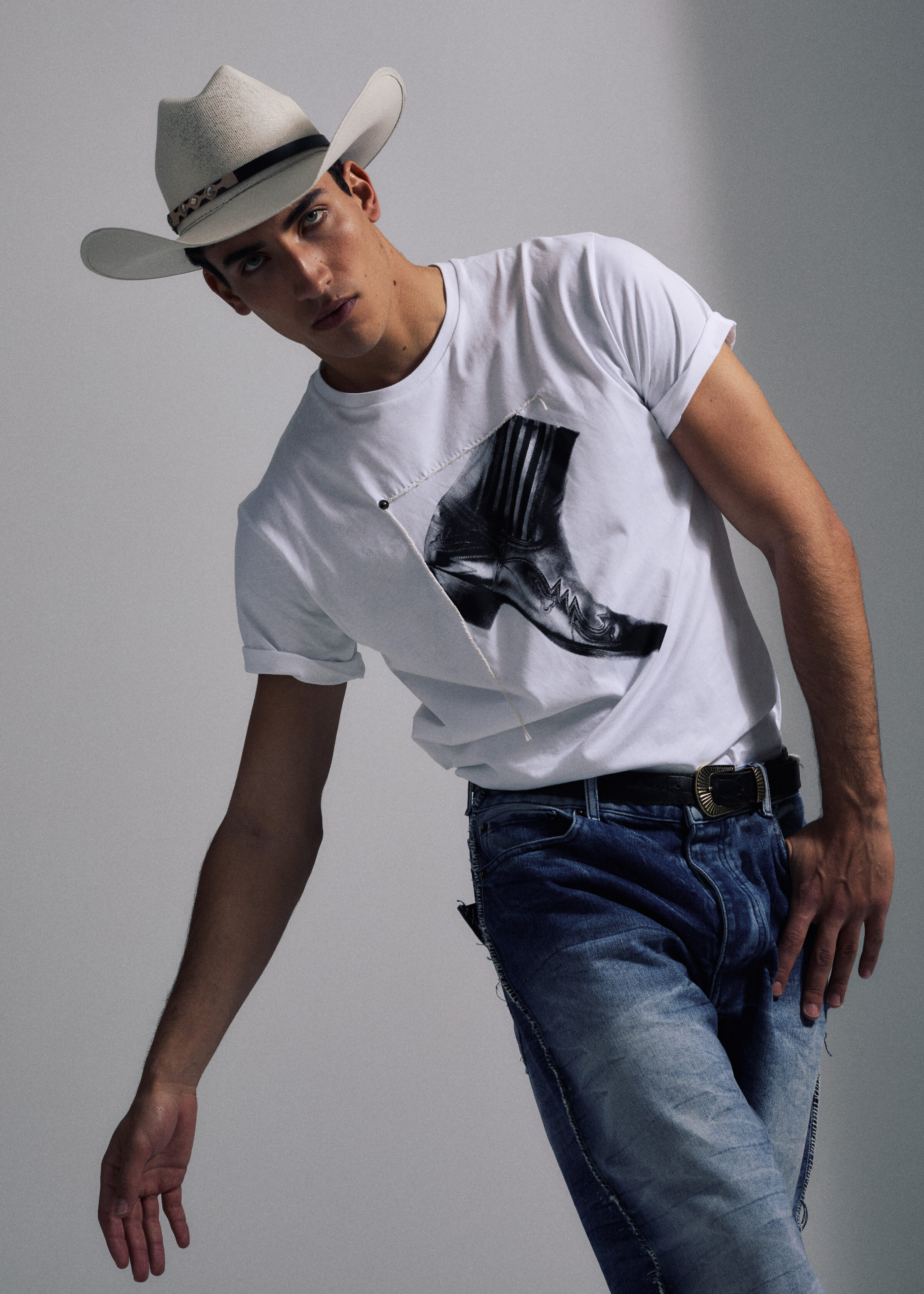 Its standout feature is a silk-screened cowboy boot on the front, printed with water-based inks to achieve a subtle vintage effect that evolves with wear and washing. Two hand-stitched cuts frame the boot’s edges, accented by a signature “Leduc” rivet at the intersection of the seams—an understated mark of craftsmanship.