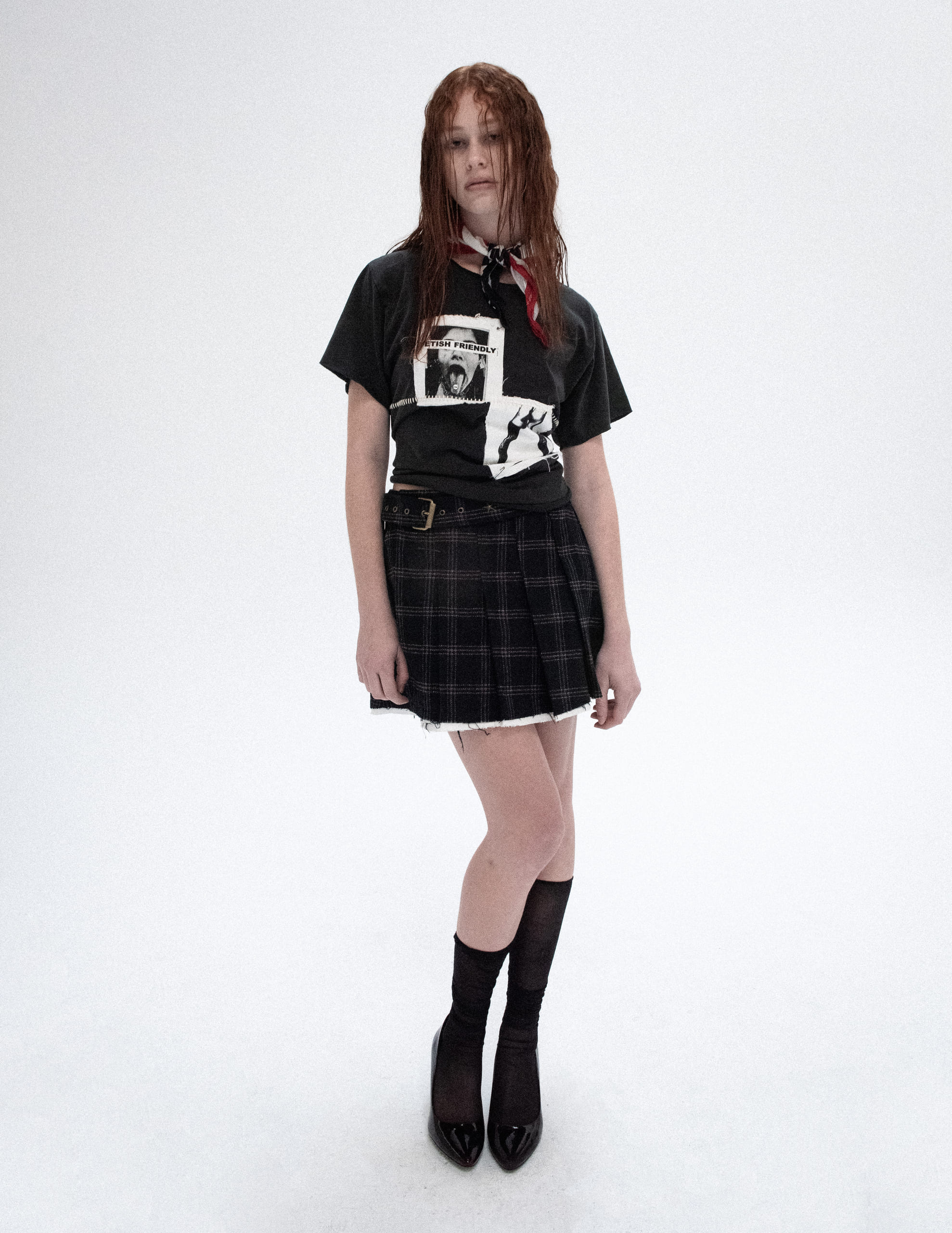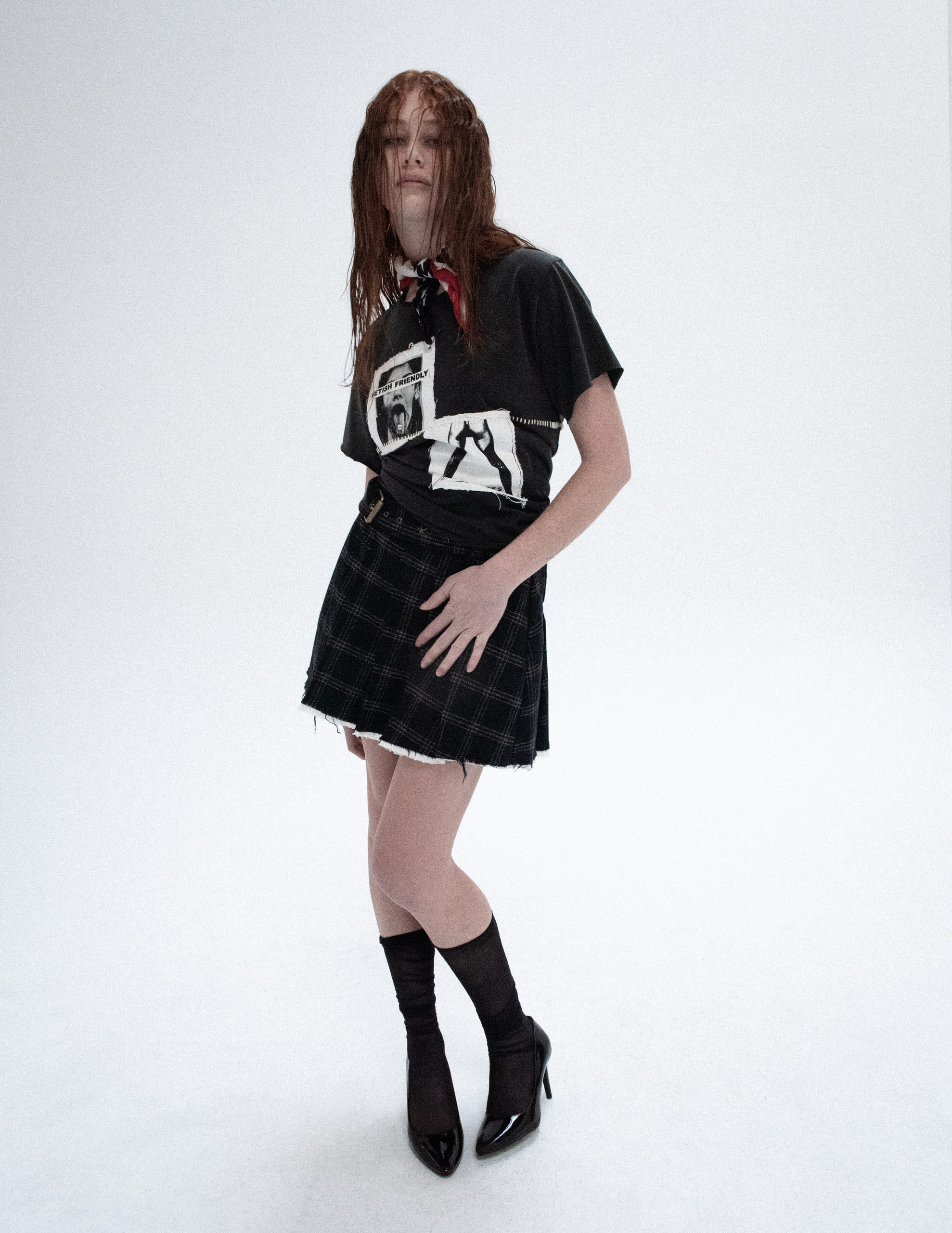 On the front, two bold screen-printed patches. One features a nude woman, legs provocatively parted, with the words “The gates of hell are now open” emblazoned across the center — unapologetic and confrontational. The second, a portrait of a woman with her eyes obscured by a blood-red block reading “Fetish Friendly”, adds mystery and tension.