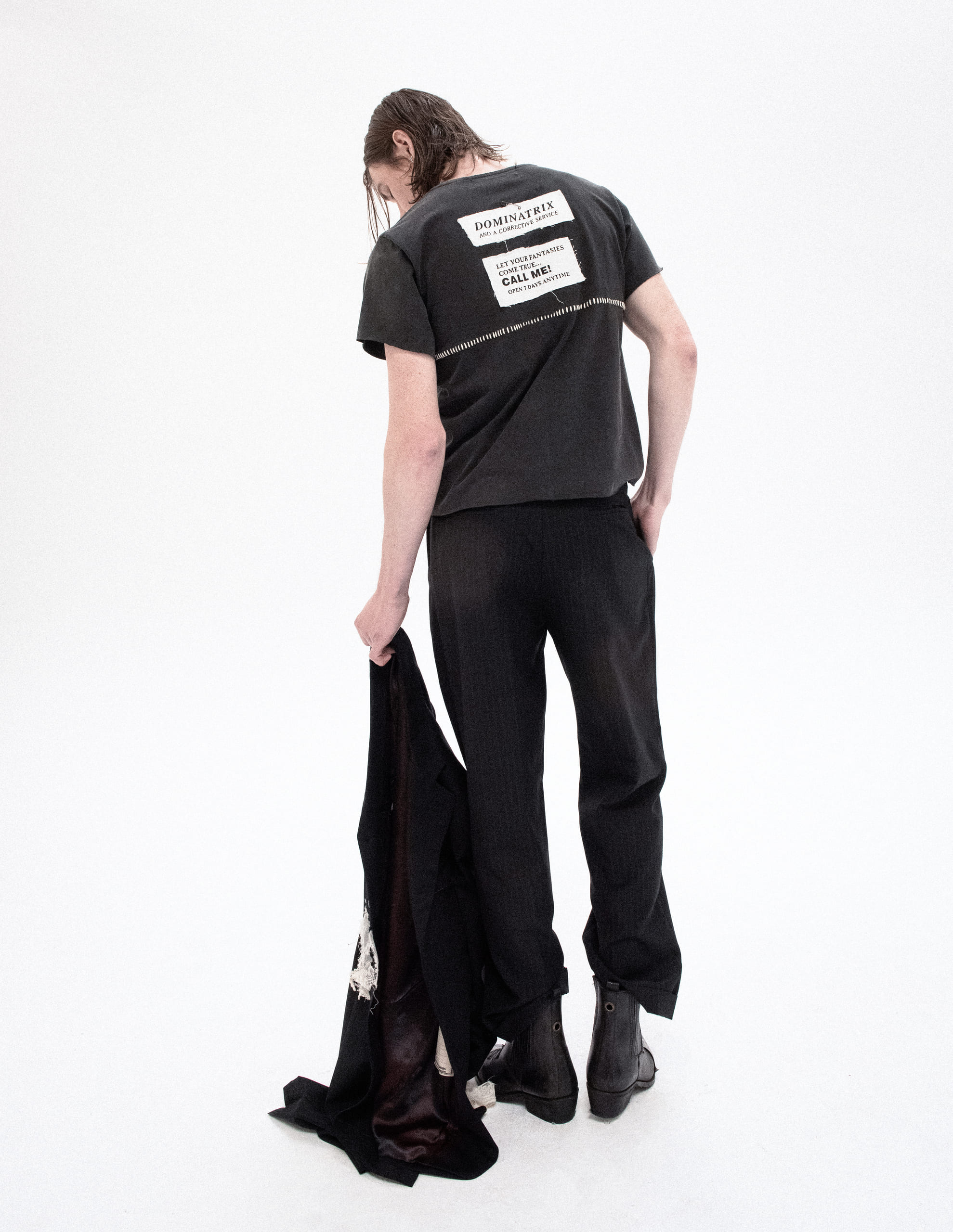 Turn around, and the narrative continues. Two more hand-stitched patches decorate the back. The top one declares: “Dominatrix and Corrective Service”, a cold whisper of power and control. Below, its seductive reply: