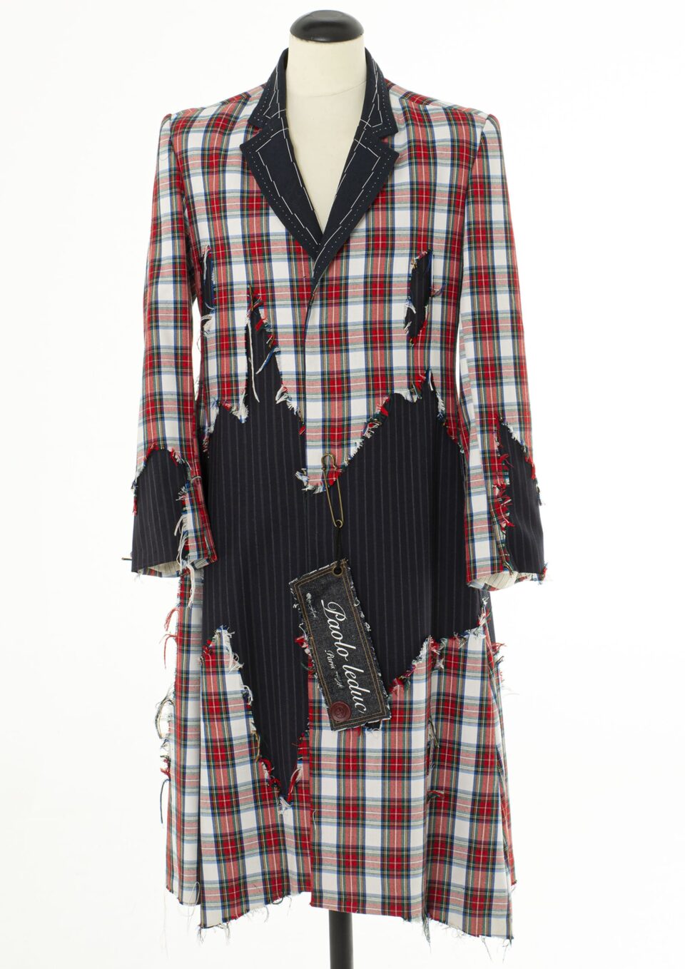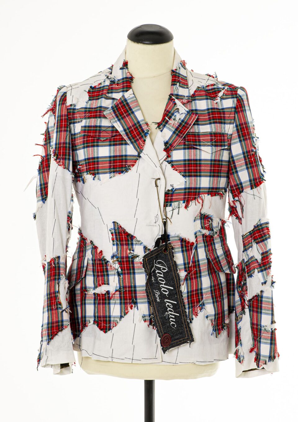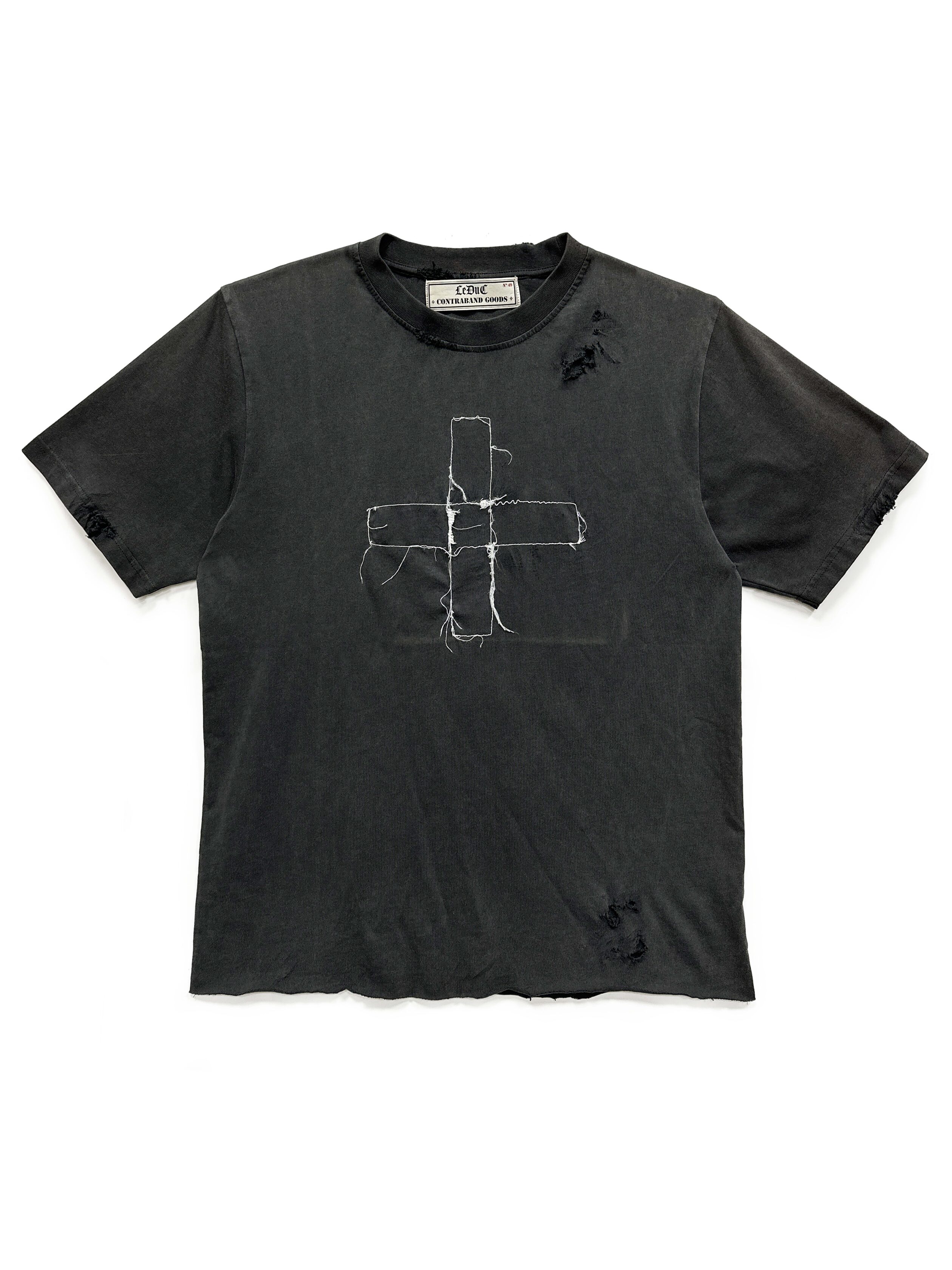 Cross-shaped patch sewn and removed, leaving topstitching on the front. LEDUC metal decal on the back, hand-stitched.