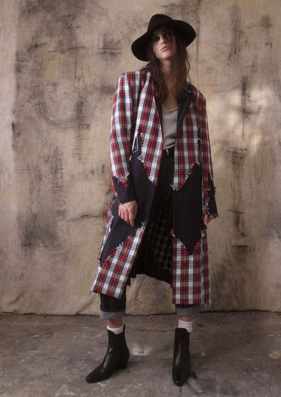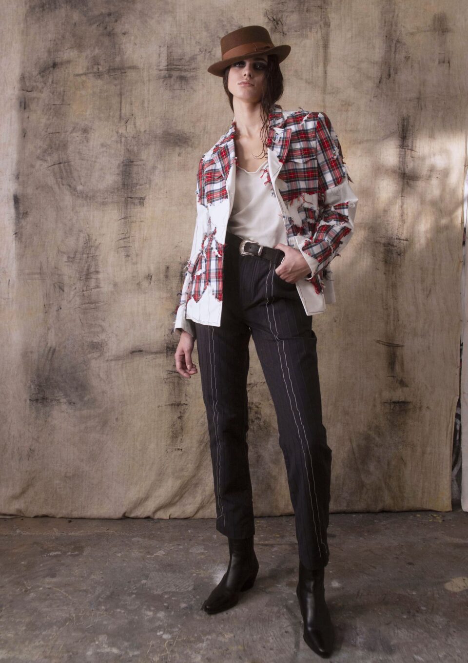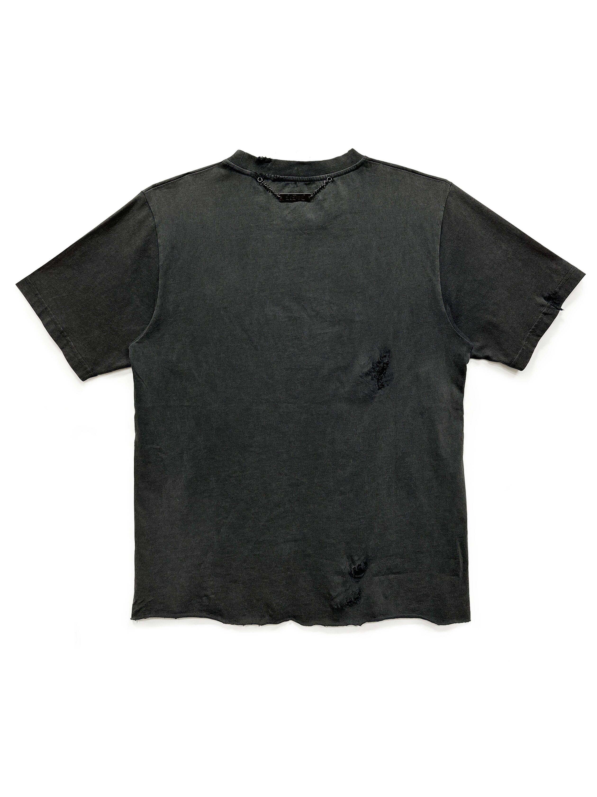 Cross-shaped patch sewn and removed, leaving topstitching on the front. LEDUC metal decal on the back, hand-stitched.