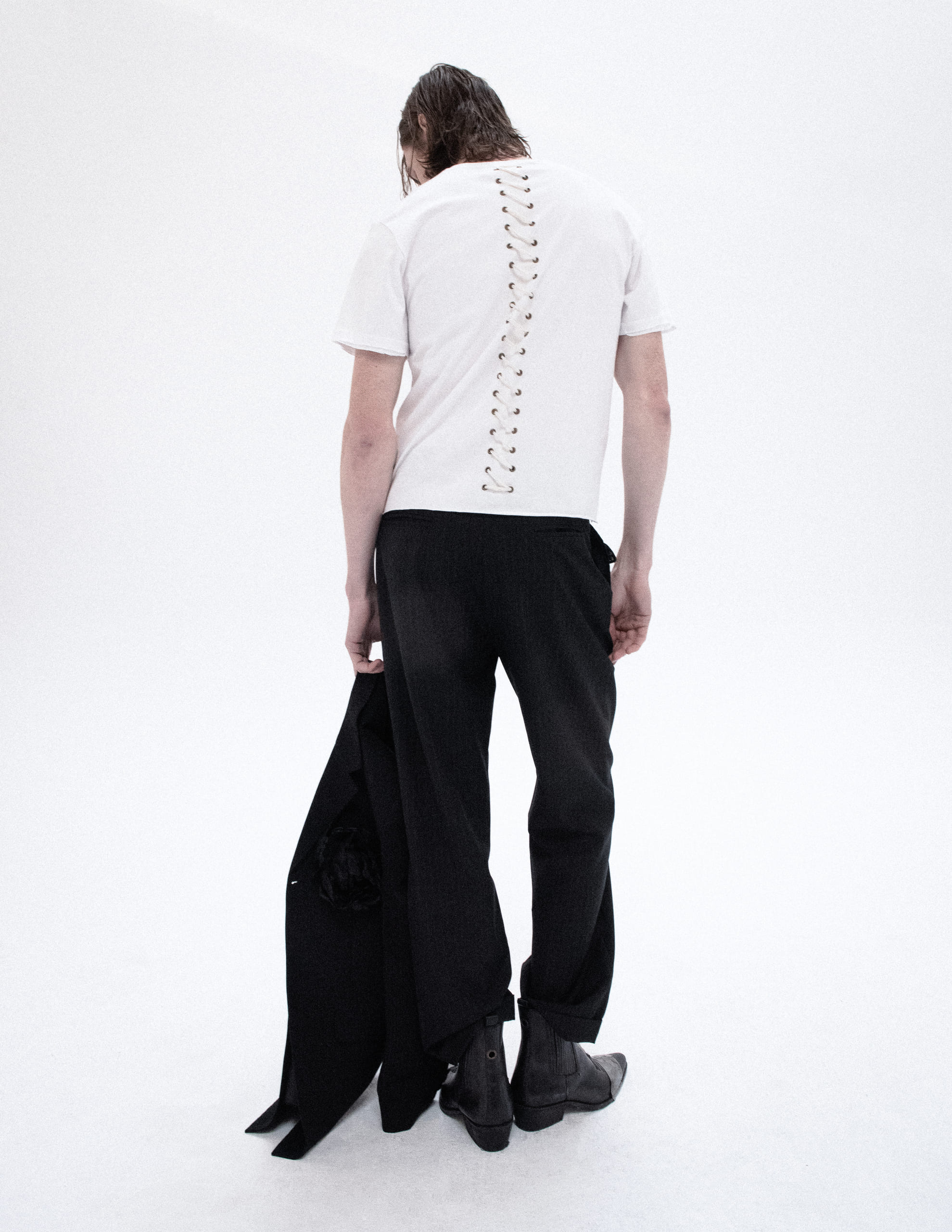 The back is where the seduction continues: an intricate web of antique gold eyelets punches through the fabric, laced with a hand-braided six-strand raw cotton cord running down the spine in a crisscross pattern. Reinforced with an inner placket for structure and durability, it’s not just design — it’s craftsmanship.