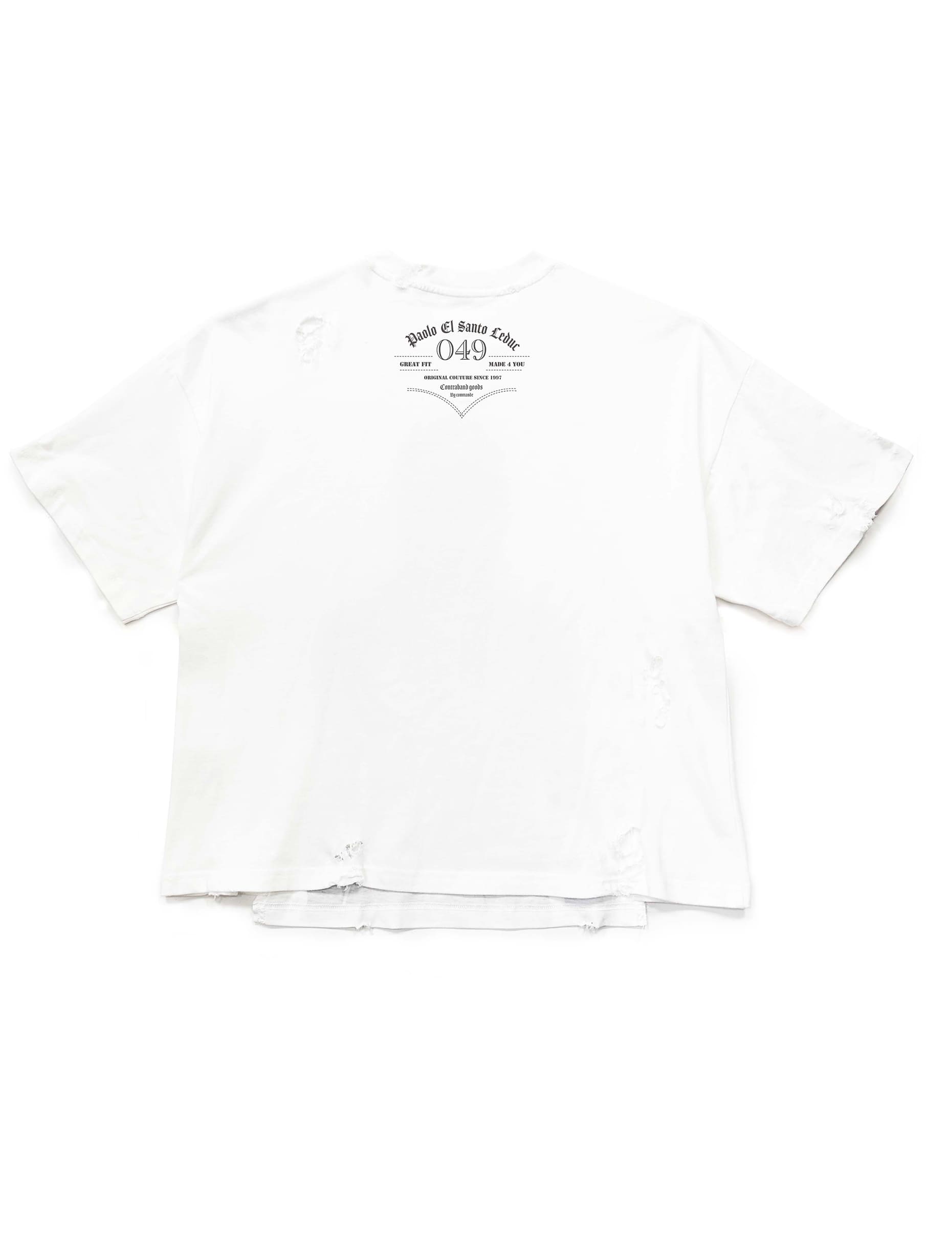 T-shirt with hand cut and overlapped overlay of silk screen print at front of “LEDUC FACE”. Silk screen print water base ink giving a vintage effect. 2 brass stud rivets at top.
