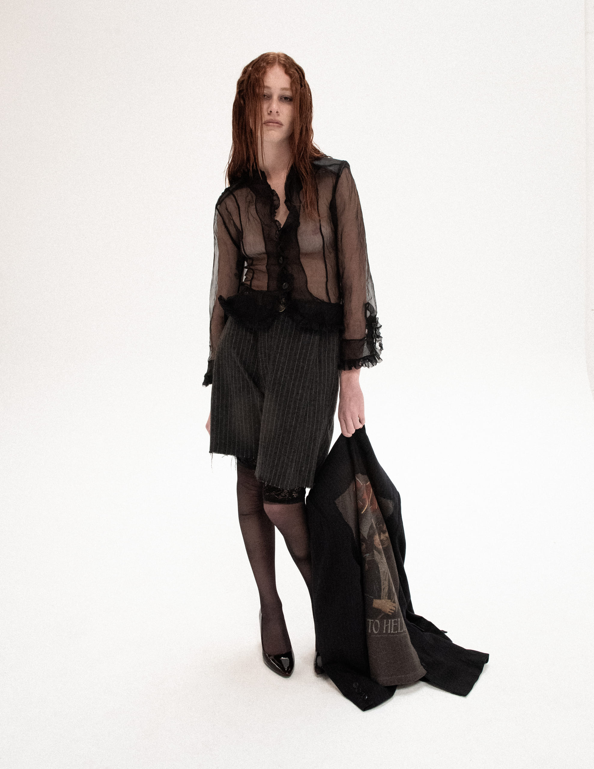 - The Raw Hem: The leg openings are deliberately left “raw“, providing that deconstructed sensation of having impulsively cut a pair of classic suit trousers—an intentional imperfection.