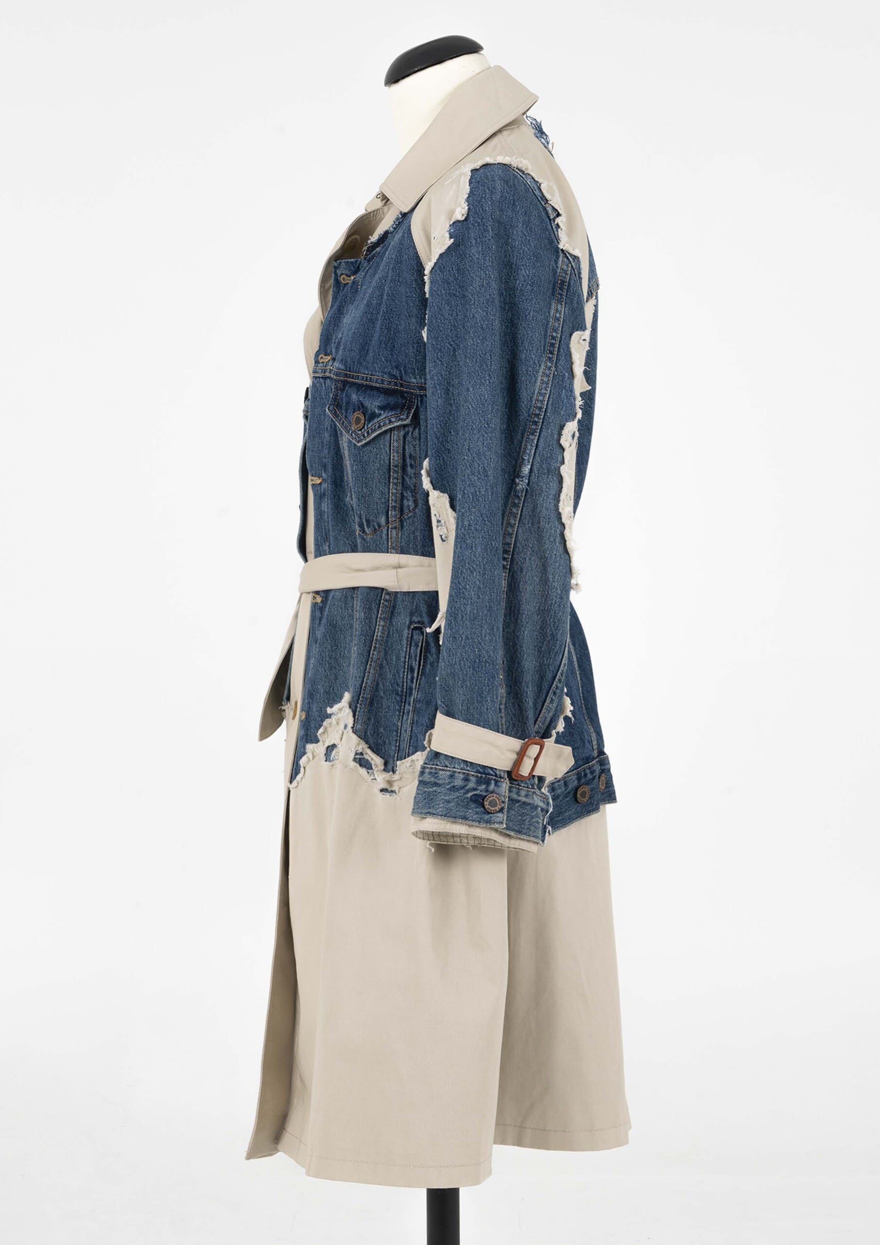 Cream trench coat, raglan sleeves with denim jacket application inserted on the trench coat. Ripped and distressed by hand. Unisex.